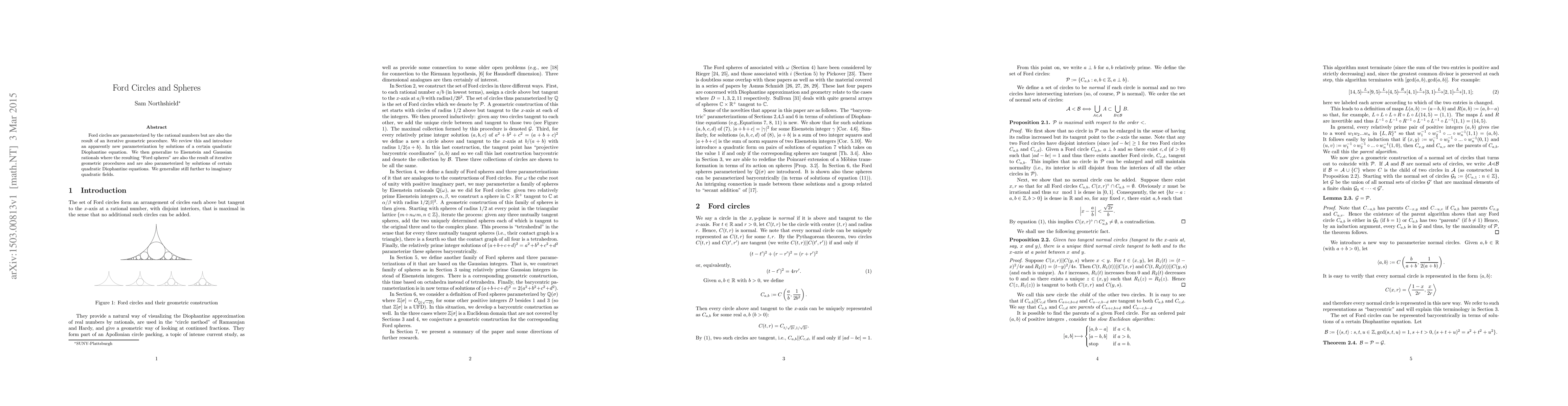 This paper explores the geometric nature of Ford circles and spheres, introducing a new parameterization via solutions to quadratic Diophantine equations and extending this to Eisenstein and Gaussian rationals, with implications for imaginary quadratic fields.