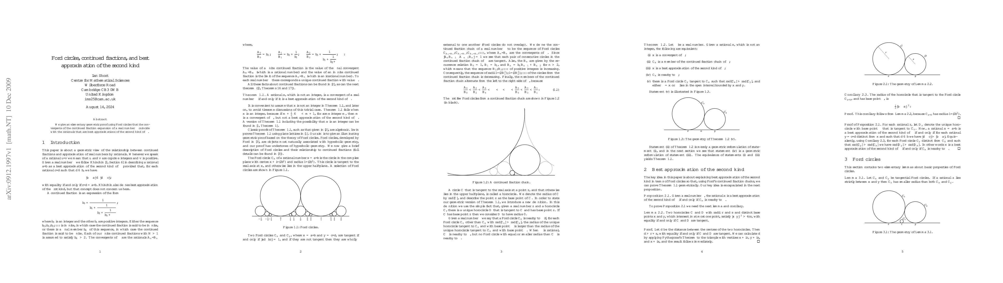Summary: This paper presents a geometric proof using Ford circles to show that the convergents of a real number's continued fraction expansion correspond to its best rational approximations of the second kind. This establishes a visual link between continued fractions and number theory.