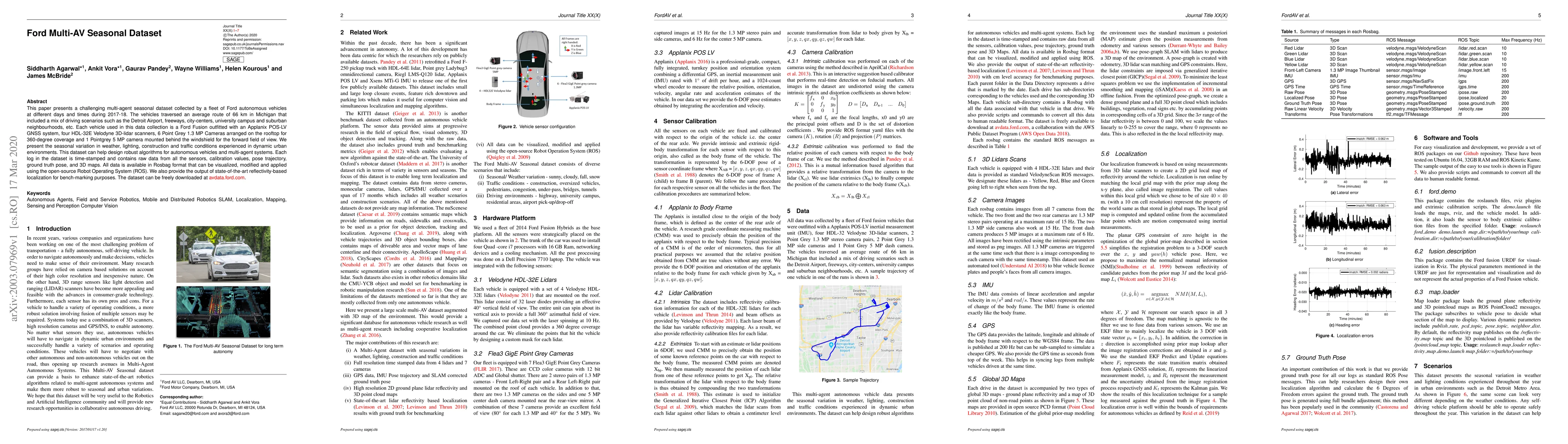 This paper presents a challenging multi-agent seasonal dataset collected by a fleet of Ford autonomous vehicles at different days and times during 2017-18. The vehicles traversed an average route of 66 km in Michigan that included a mix of driving scenarios such as the Detroit Airport, freeways, city-centers, university campus and suburban neighbourhoods, etc. Each vehicle used in this data collection is a Ford Fusion outfitted with an Applanix POS-LV GNSS system, four HDL-32E Velodyne 3D-lidar scanners, 6 Point Grey 1.3 MP Cameras arranged on the rooftop for 360-degree coverage and 1 Pointgrey 5 MP camera mounted behind the windshield for the forward field of view. We present the seasonal variation in weather, lighting, construction and traffic conditions experienced in dynamic urban environments. This dataset can help design robust algorithms for autonomous vehicles and multi-agent systems. Each log in the dataset is time-stamped and contains raw data from all the sensors, calibration values, pose trajectory, ground truth pose, and 3D maps. All data is available in Rosbag format that can be visualized, modified and applied using the open-source Robot Operating System (ROS). We also provide the output of state-of-the-art reflectivity-based localization for bench-marking purposes. The dataset can be freely downloaded at our website.