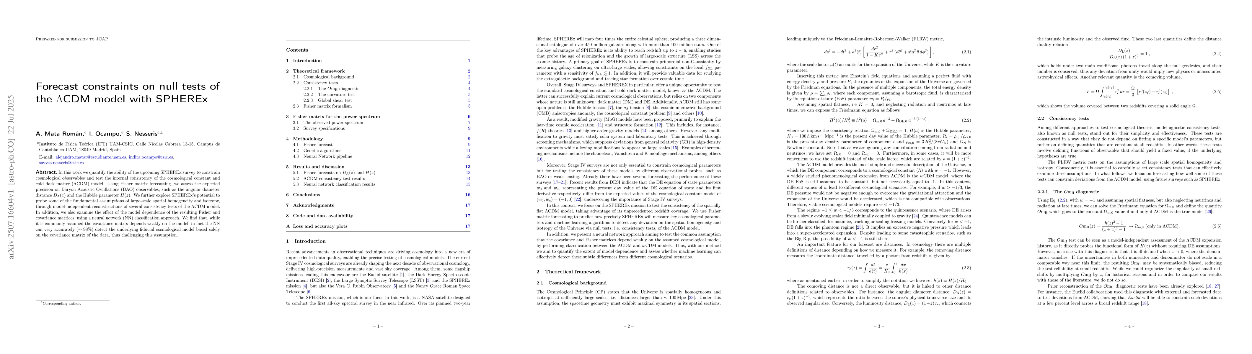 In this work we quantify the ability of the upcoming SPHEREx survey to constrain cosmological observables and test the internal consistency of the cosmological constant and cold dark matter ($\Lambda$CDM) model. Using Fisher matrix forecasting, we assess the expected precision on Baryon Acoustic Oscillations (BAO) observables, such as the angular diameter distance $D_\mathrm{A}(z)$ and the Hubble parameter $H(z)$. We further explore SPHEREx's potential to probe some of the fundamental assumptions of large-scale spatial homogeneity and isotropy, through model-independent reconstructions of several consistency tests of the $\Lambda$CDM model. In addition, we also examine the effect of the model dependence of the resulting Fisher and covariance matrices, using a neural network (NN) classification approach. We find that, while it is commonly assumed the covariance matrix depends weakly on the model, in fact the NN can very accurately ($\sim 98\%$) detect the underlying fiducial cosmological model based solely on the covariance matrix of the data, thus challenging this assumption.