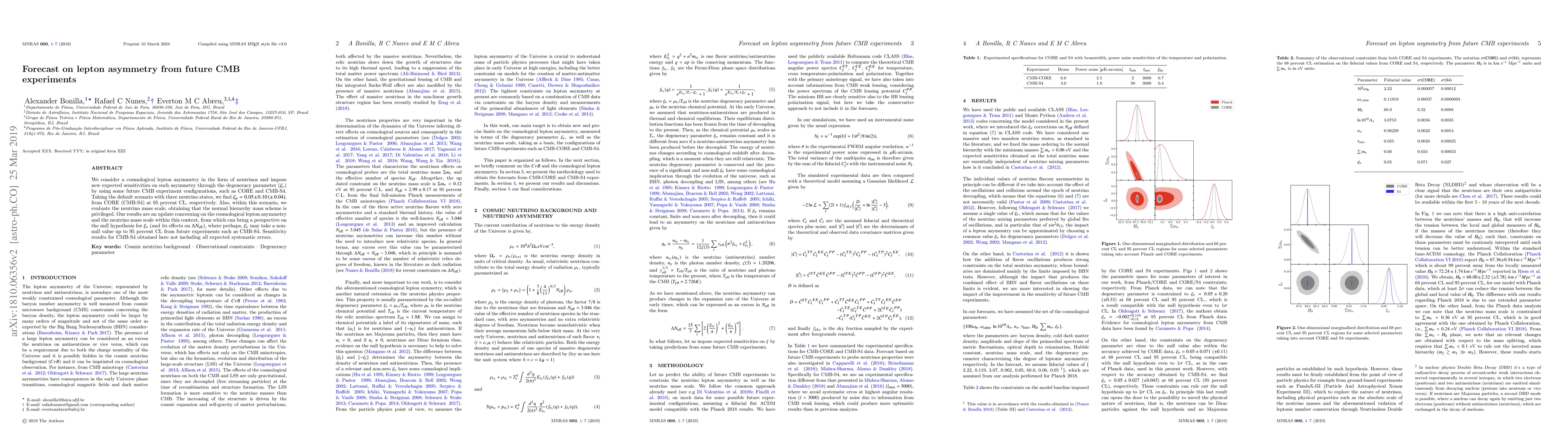 This paper forecasts the cosmological lepton asymmetry in neutrinos using future CMB experiments like CORE and CMB-S4, finding $\xi_{\mu} = 0.05 \pm 0.10$ for CORE and a tighter constraint for CMB-S4. It also favors the normal hierarchy for neutrino mass scales.