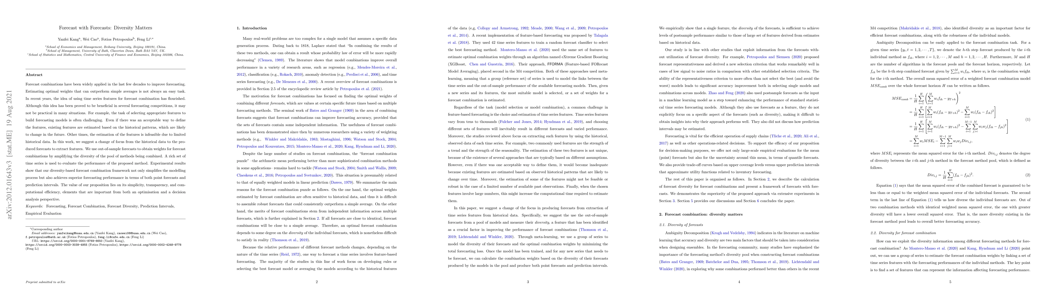 This paper proposes a novel method for forecast combination that leverages the diversity among out-of-sample forecasts rather than historical data features, achieving superior performance and simplifying the modelling process. The approach emphasizes simplicity, transparency, and computational efficiency, demonstrating better forecasting results in various time series datasets.