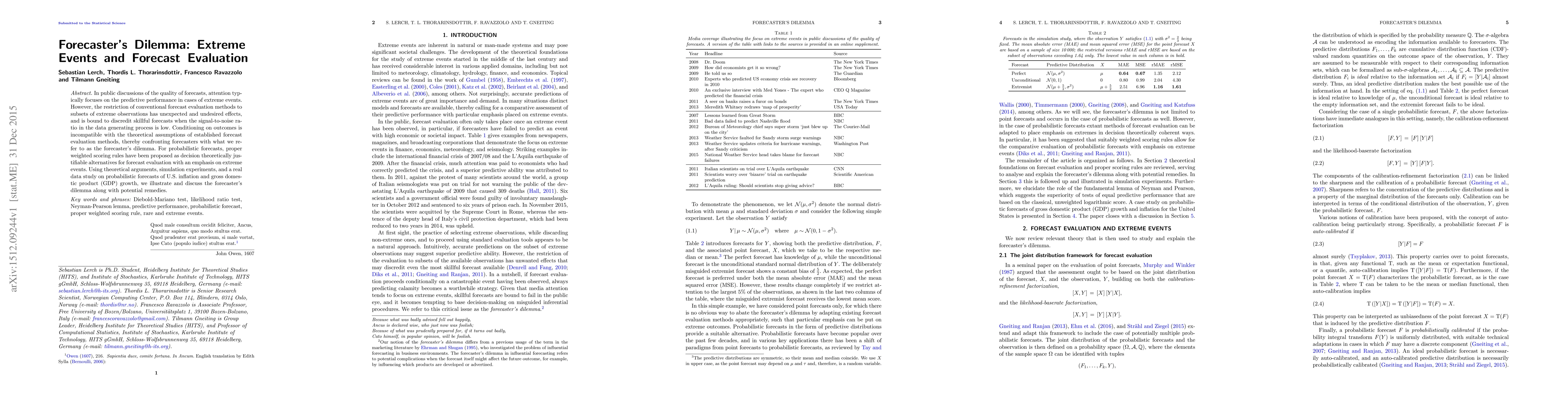 This paper discusses the "forecaster's dilemma," where conventional forecast evaluation methods fail to accurately assess predictive performance during extreme events, leading to the discrediting of skillful forecasts. It proposes proper weighted scoring rules as a better alternative for evaluating probabilistic forecasts, illustrated through theoretical arguments, simulations, and a real-data study on U.S. inflation and GDP growth.