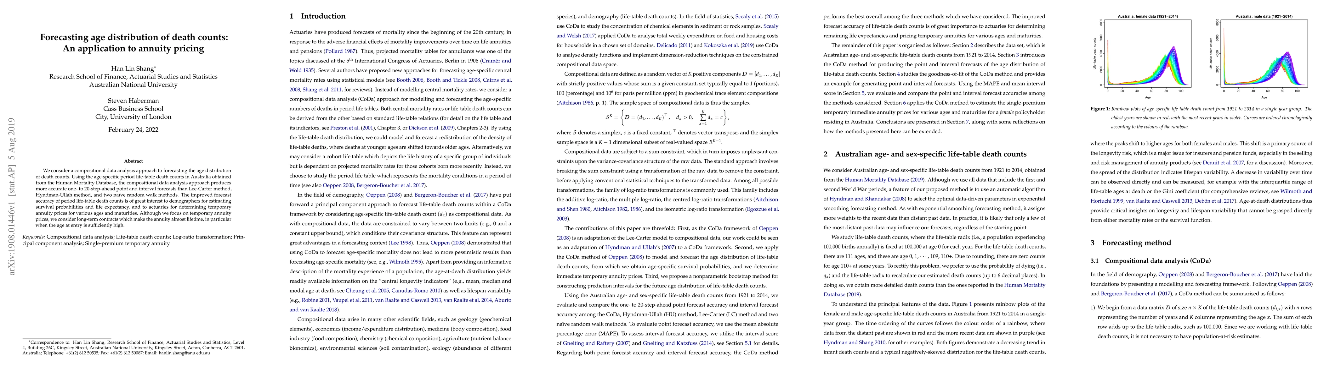 This paper proposes a compositional data analysis approach for forecasting age distribution of death counts, which outperforms existing methods like the Lee-Carter and Hyndman-Ullah methods. The improved forecasts are valuable for demographers and actuaries, especially for pricing temporary annuities and estimating life expectancy.