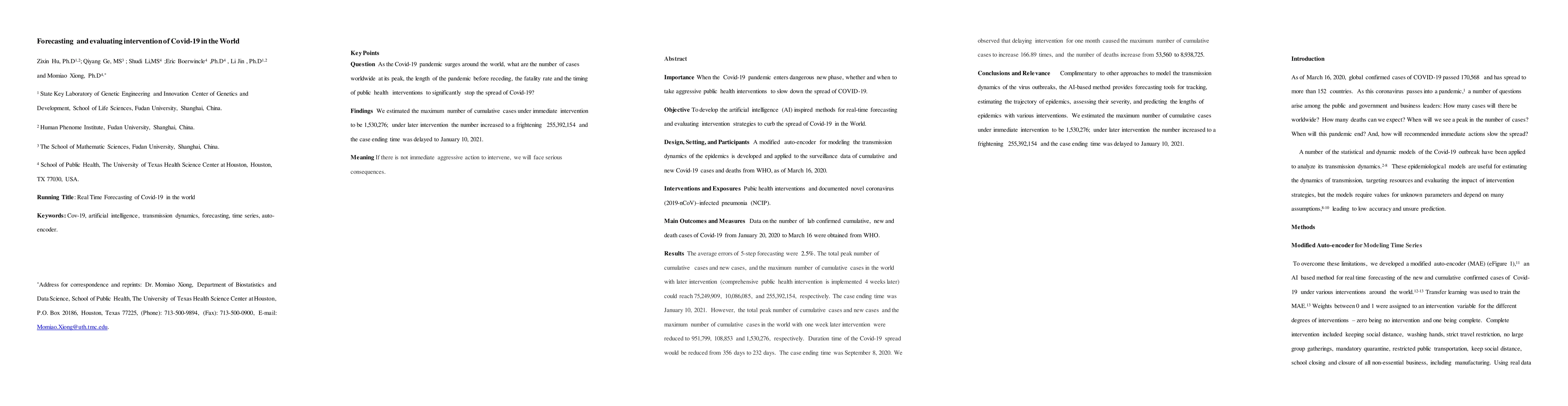 When the Covid-19 pandemic enters dangerous new phase, whether and when to take aggressive public health interventions to slow down the spread of COVID-19. To develop the artificial intelligence (AI) inspired methods for real-time forecasting and evaluating intervention strategies to curb the spread of Covid-19 in the World. A modified auto-encoder for modeling the transmission dynamics of the epidemics is developed and applied to the surveillance data of cumulative and new Covid-19 cases and deaths from WHO, as of March 16, 2020. The average errors of 5-step forecasting were 2.5%. The total peak number of cumulative cases and new cases, and the maximum number of cumulative cases in the world with later intervention (comprehensive public health intervention is implemented 4 weeks later) could reach 75,249,909, 10,086,085, and 255,392,154, respectively. The case ending time was January 10, 2021. However, the total peak number of cumulative cases and new cases and the maximum number of cumulative cases in the world with one week later intervention were reduced to 951,799, 108,853 and 1,530,276, respectively. Duration time of the Covid-19 spread would be reduced from 356 days to 232 days. The case ending time was September 8, 2020. We observed that delaying intervention for one month caused the maximum number of cumulative cases to increase 166.89 times, and the number of deaths increase from 53,560 to 8,938,725. We will face disastrous consequences if immediate action to intervene is not taken.