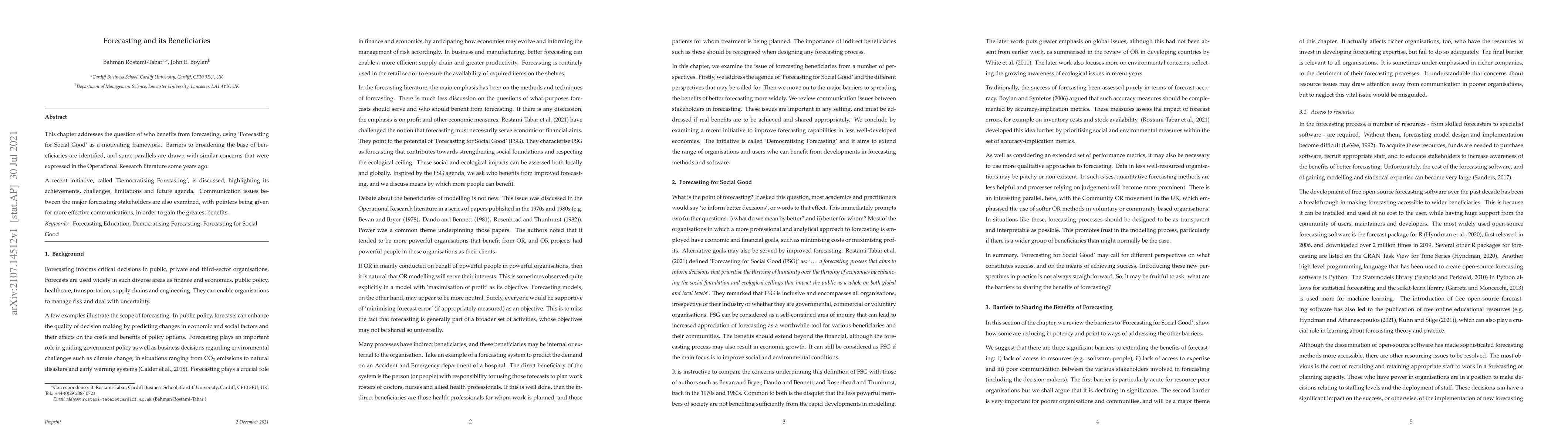This chapter addresses the question of who benefits from forecasting, using Forecasting for Social Good as a motivating framework. Barriers to broadening the base of beneficiaries are identified, and some parallels are drawn with similar concerns that were expressed in the Operational Research literature some years ago. A recent initiative, called Democratising Forecasting, is discussed, highlighting its achievements, challenges, limitations and future agenda. Communication issues be-tween the major forecasting stakeholders are also examined, with pointers being given for more effective communications, in order to gain the greatest benefits