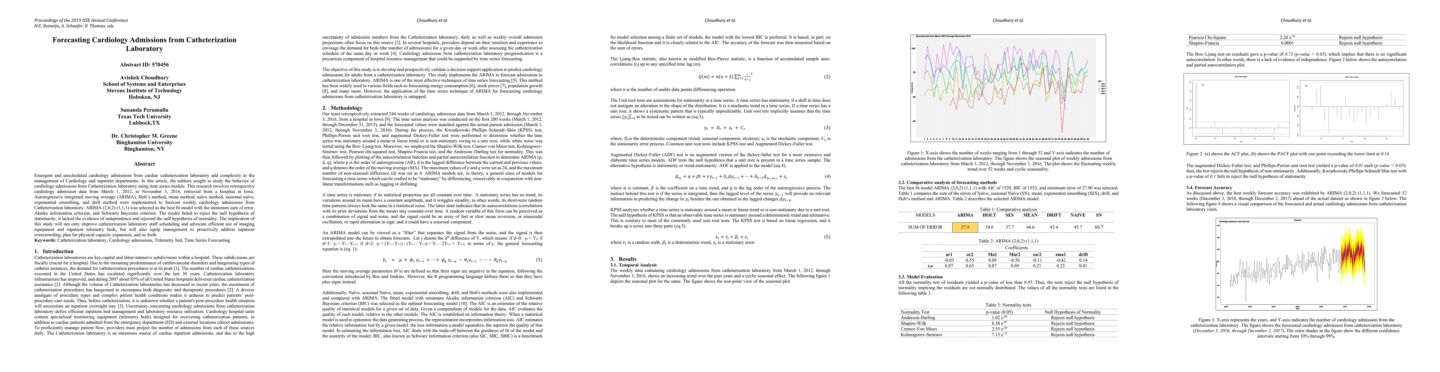 This study used time series models to forecast weekly cardiology admissions from a catheterization lab, identifying ARIMA (2,0,2) (1,1,1) as the best-fit model. The findings can optimize staff scheduling, equipment use, and hospital capacity planning.