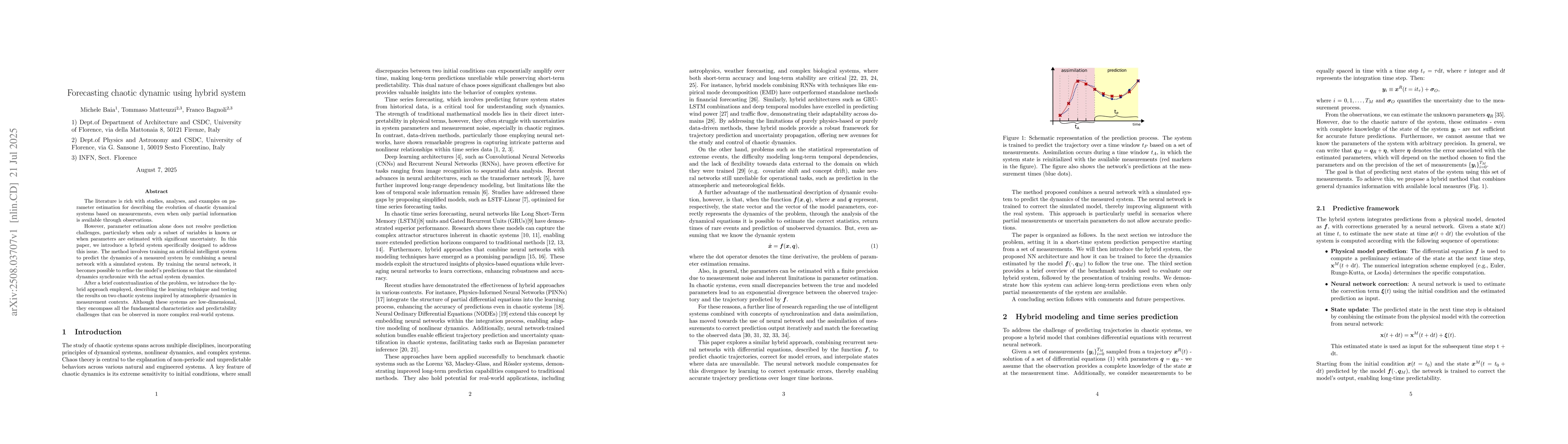 The literature is rich with studies, analyses, and examples on parameter estimation for describing the evolution of chaotic dynamical systems based on measurements, even when only partial information is available through observations. However, parameter estimation alone does not resolve prediction challenges, particularly when only a subset of variables is known or when parameters are estimated with significant uncertainty. In this paper, we introduce a hybrid system specifically designed to address this issue. The method involves training an artificial intelligent system to predict the dynamics of a measured system by combining a neural network with a simulated system. By training the neural network, it becomes possible to refine the model's predictions so that the simulated dynamics synchronize with the actual system dynamics. After a brief contextualization of the problem, we introduce the hybrid approach employed, describing the learning technique and testing the results on two chaotic systems inspired by atmospheric dynamics in measurement contexts. Although these systems are low-dimensional, they encompass all the fundamental characteristics and predictability challenges that can be observed in more complex real-world systems.