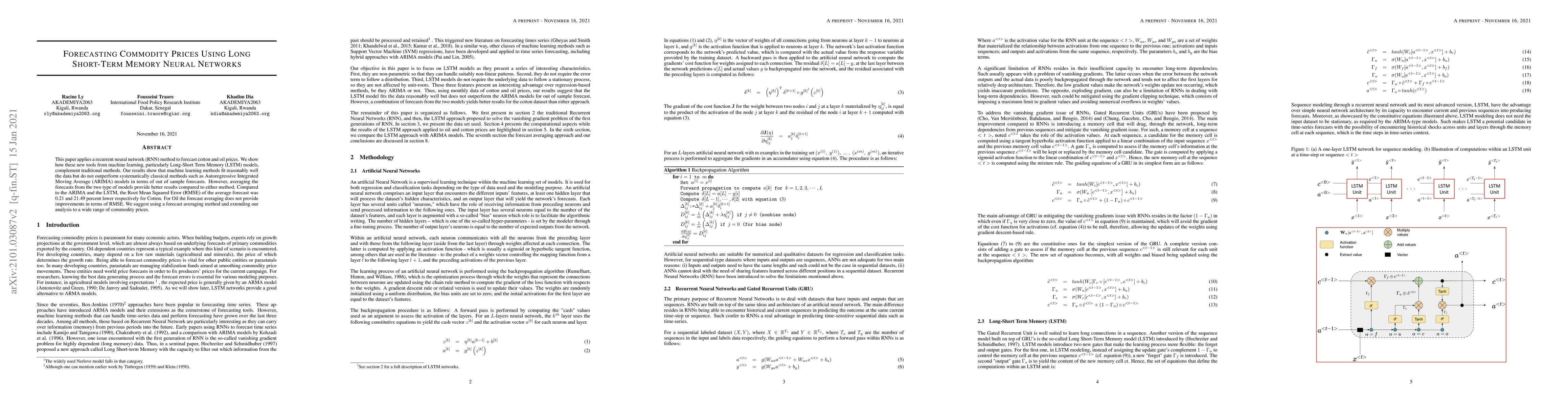 This paper uses Long Short-Term Memory neural networks to forecast cotton and oil prices, finding that combining models improves results, but machine learning methods don't outperform traditional ARIMA models.