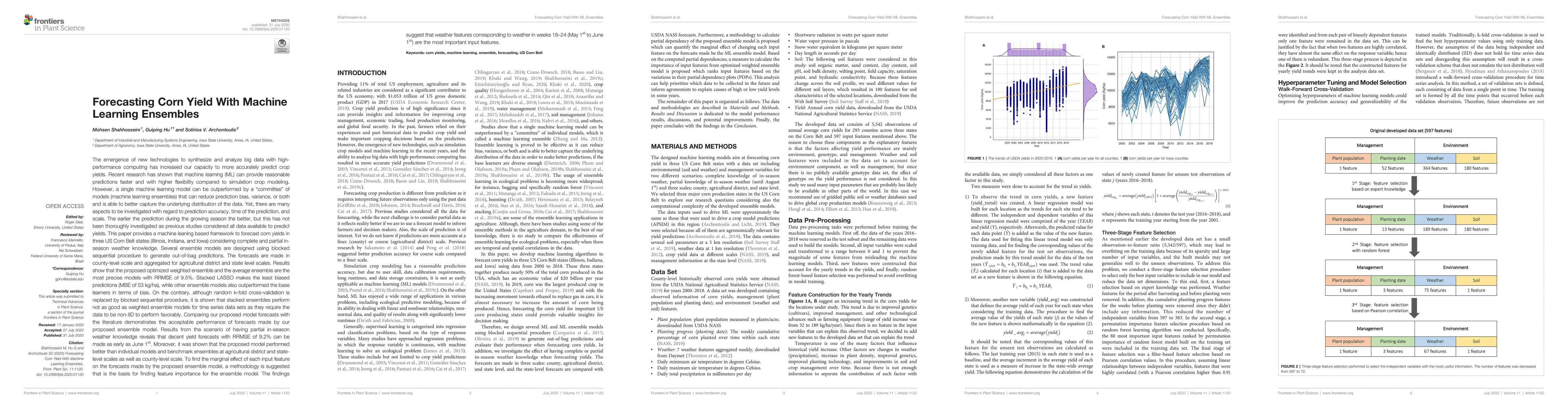 This paper develops a machine learning ensemble framework to forecast corn yields in Illinois, Indiana, and Iowa, showing improved accuracy and bias reduction compared to individual models. The study demonstrates that early forecasts, as early as June 1st, are feasible and highlights the importance of weather features from May to early June.