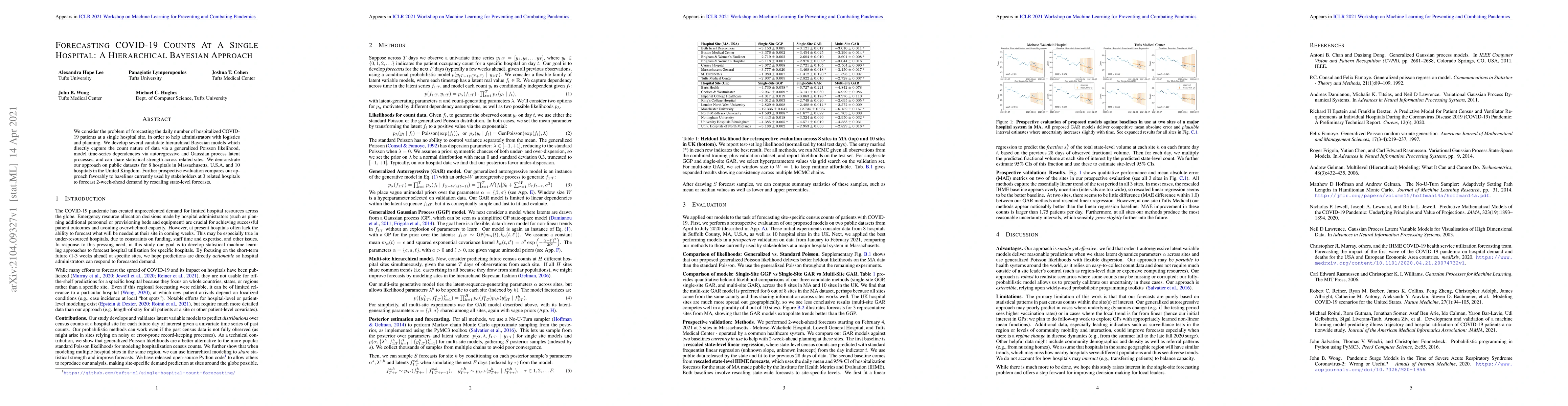 This study develops a hierarchical Bayesian model to forecast hospital COVID-19 patient counts, achieving favorable results compared to existing baselines in 2-week-ahead demand forecasting for multiple hospitals.