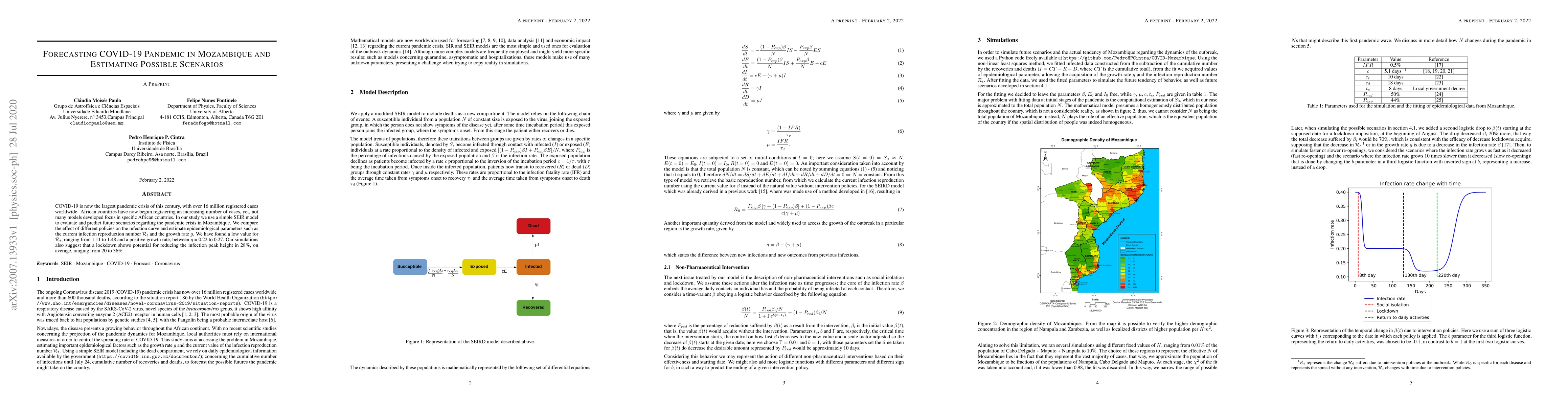 COVID-19 is now the largest pandemic crisis of this century, with over 16 million registered cases worldwide. African countries have now begun registering an increasing number of cases, yet, not many models developed focus in specific African countries. In our study we use a simple SEIR model to evaluate and predict future scenarios regarding the pandemic crisis in Mozambique. We compare the effect of different policies on the infection curve and estimate epidemiological parameters such as the current infection reproduction number Rt and the growth rate g. We have found a low value for Rt, ranging from 1.11 to 1.48 and a positive growth rate, between g = 0.22 to 0.27. Our simulations also suggest that a lockdown shows potential for reducing the infection peak height in 28%, on average, ranging from 20 to 36%.
