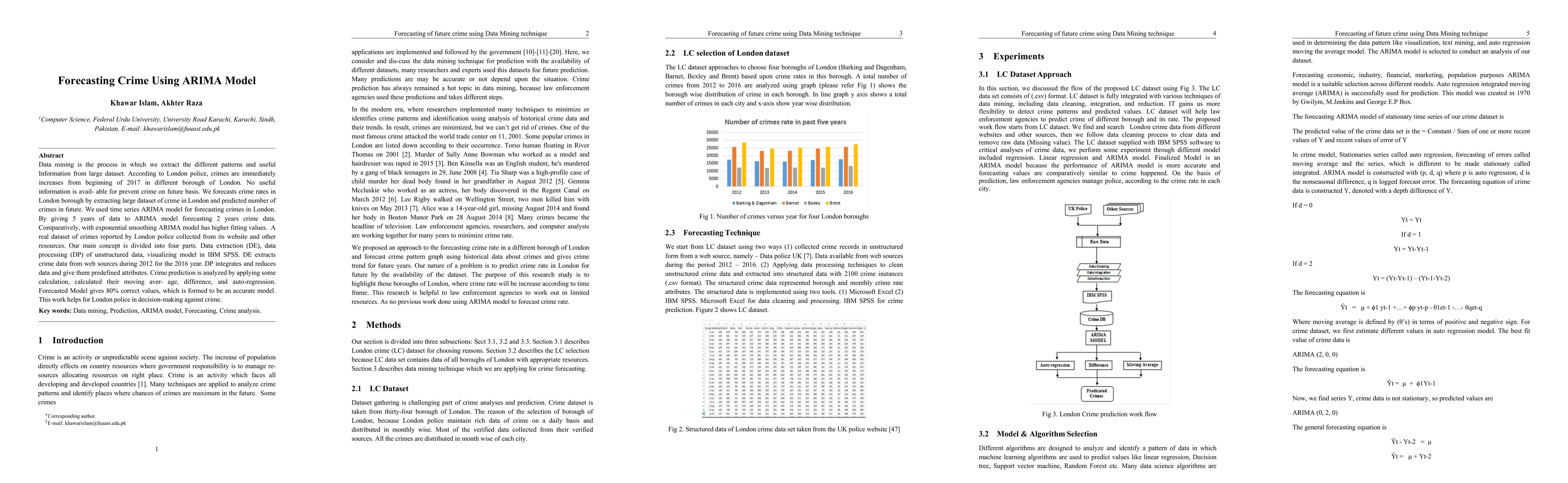 Data mining is the process in which we extract the different patterns and useful Information from large dataset. According to London police, crimes are immediately increases from beginning of 2017 in different borough of London. No useful information is available for prevent crime on future basis. We forecasts crime rates in London borough by extracting large dataset of crime in London and predicted number of crimes in future. We used time series ARIMA model for forecasting crimes in London. By giving 5 years of data to ARIMA model forecasting 2 years crime data. Comparatively, with exponential smoothing ARIMA model has higher fitting values. A real dataset of crimes reported by London police collected from its website and other resources. Our main concept is divided into four parts. Data extraction (DE), data processing (DP) of unstructured data, visualizing model in IBM SPSS. DE extracts crime data from web sources during 2012 for the 2016 year. DP integrates and reduces data and give them predefined attributes. Crime prediction is analyzed by applying some calculation, calculated their moving average, difference, and auto-regression. Forecasted Model gives 80% correct values, which is formed to be an accurate model. This work helps for London police in decision-making against crime.