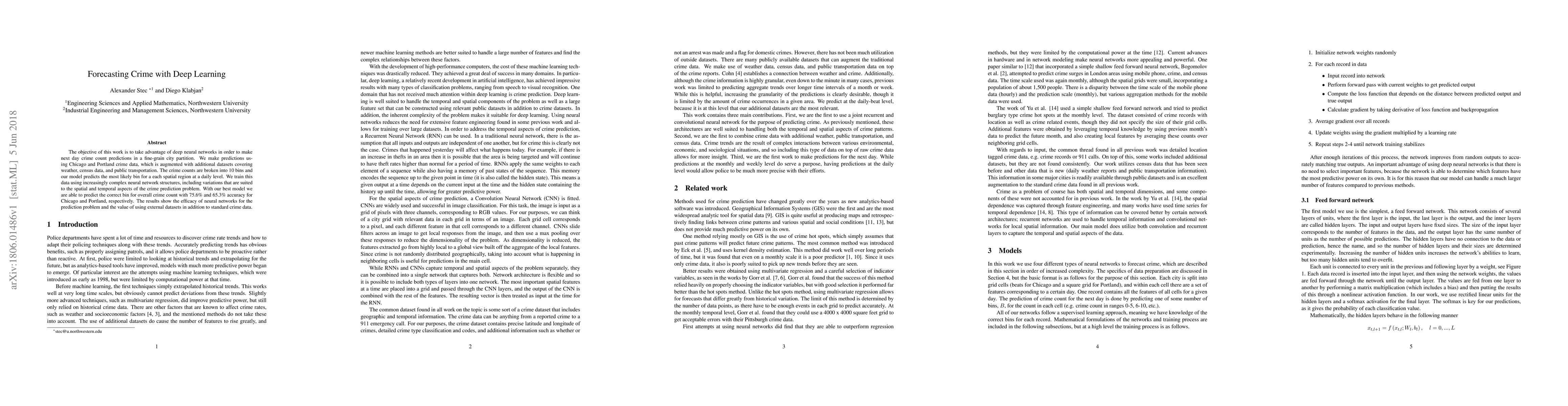 This research paper uses deep learning to predict daily crime counts in cities like Chicago and Portland with high accuracy, demonstrating the efficacy of neural networks for this problem. The results show that incorporating external datasets improves prediction accuracy.