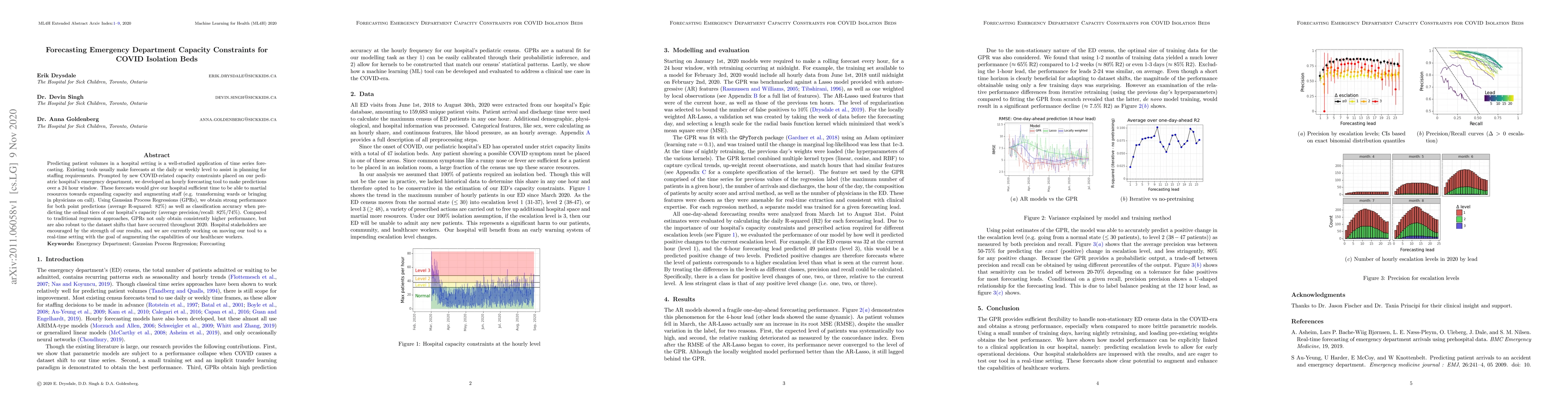 Predicting patient volumes in a hospital setting is a well-studied application of time series forecasting. Existing tools usually make forecasts at the daily or weekly level to assist in planning for staffing requirements. Prompted by new COVID-related capacity constraints placed on our pediatric hospital's emergency department, we developed an hourly forecasting tool to make predictions over a 24 hour window. These forecasts would give our hospital sufficient time to be able to martial resources towards expanding capacity and augmenting staff (e.g. transforming wards or bringing in physicians on call). Using Gaussian Process Regressions (GPRs), we obtain strong performance for both point predictions (average R-squared: 82%) as well as classification accuracy when predicting the ordinal tiers of our hospital's capacity (average precision/recall: 82%/74%). Compared to traditional regression approaches, GPRs not only obtain consistently higher performance, but are also robust to the dataset shifts that have occurred throughout 2020. Hospital stakeholders are encouraged by the strength of our results, and we are currently working on moving our tool to a real-time setting with the goal of augmenting the capabilities of our healthcare workers.