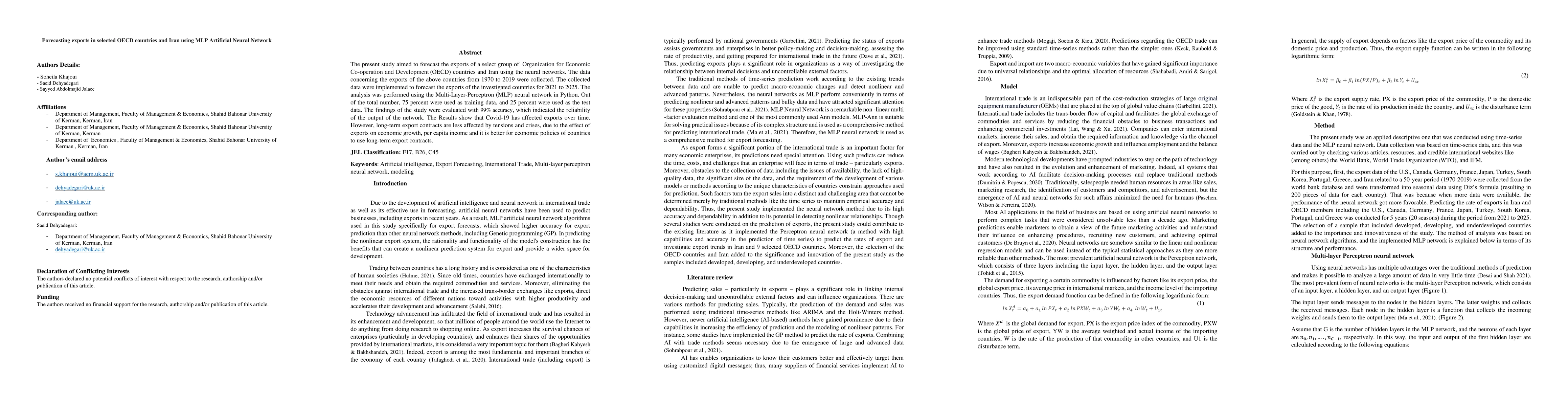 This study forecasts the exports of selected OECD countries and Iran using a Multi-Layer-Perceptron (MLP) neural network, achieving 99% accuracy. Findings indicate that while COVID-19 impacts exports, long-term contracts are more stable, suggesting their importance for economic growth and policy.