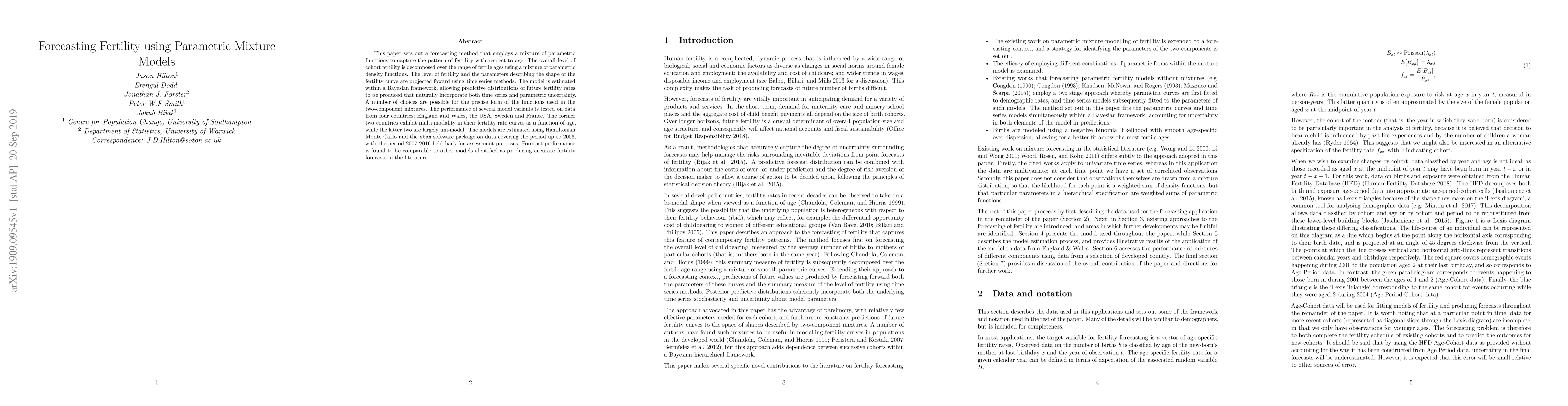 This paper sets out a forecasting method that employs a mixture of parametric functions to capture the pattern of fertility with respect to age. The overall level of cohort fertility is decomposed over the range of fertile ages using a mixture of parametric density functions. The level of fertility and the parameters describing the shape of the fertility curve are projected foward using time series methods. The model is estimated within a Bayesian framework, allowing predictive distributions of future fertility rates to be produced that naturally incorporate both time series and parametric uncertainty. A number of choices are possible for the precise form of the functions used in the two-component mixtures. The performance of several model variants is tested on data from four countries; England and Wales, the USA, Sweden and France. The former two countries exhibit multi-modality in their fertility rate curves as a function of age, while the latter two are largely uni-modal. The models are estimated using Hamiltonian Monte Carlo and the `stan` software package on data covering the period up to 2006, with the period 2007-2016 held back for assessment purposes. Forecasting performance is found to be comparable to other models identified as producing accurate fertility forecasts in the literature.