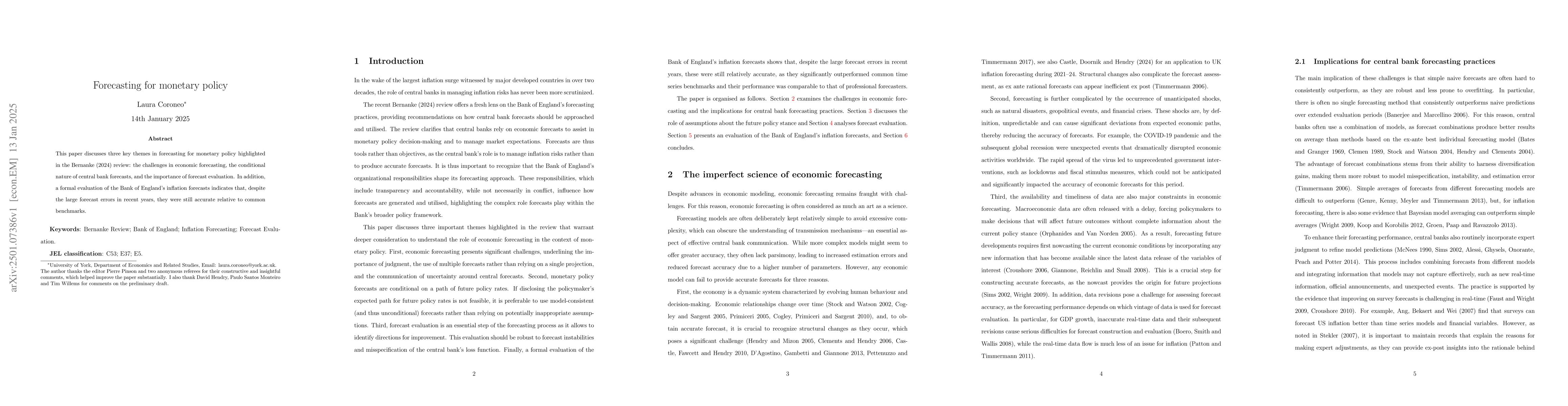 This paper discusses three key themes in forecasting for monetary policy highlighted in the Bernanke (2024) review: the challenges in economic forecasting, the conditional nature of central bank forecasts, and the importance of forecast evaluation. In addition, a formal evaluation of the Bank of England's inflation forecasts indicates that, despite the large forecast errors in recent years, they were still accurate relative to common benchmarks.