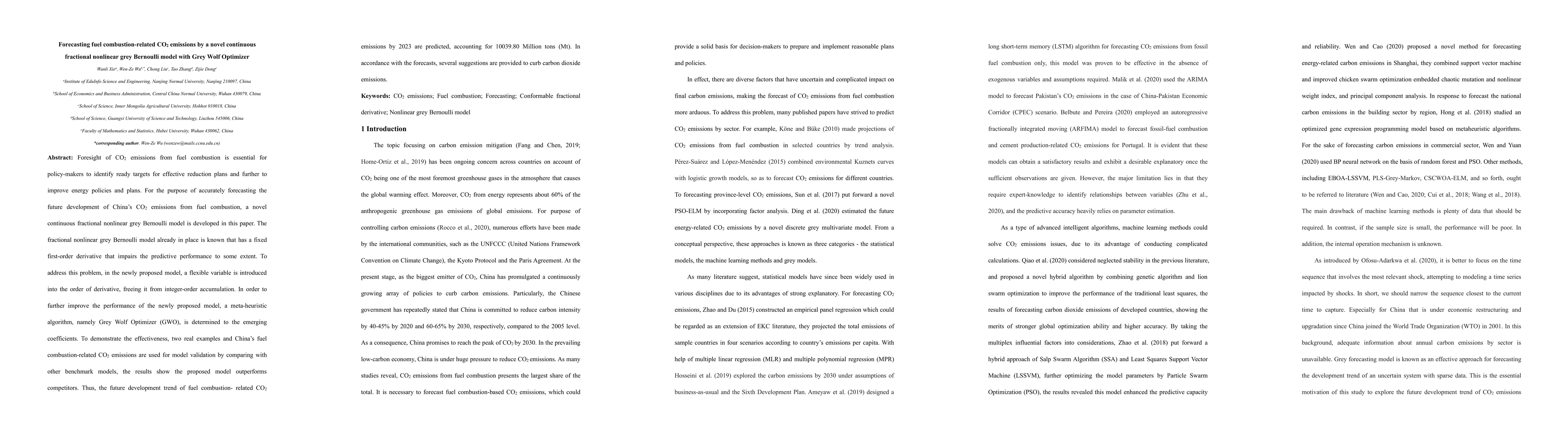 This paper introduces a new continuous fractional nonlinear grey Bernoulli model enhanced by the Grey Wolf Optimizer to accurately forecast CO$_2$ emissions from fuel combustion in China. The proposed model improves predictive performance by allowing variable-order derivatives, outperforming other benchmark models in validation.