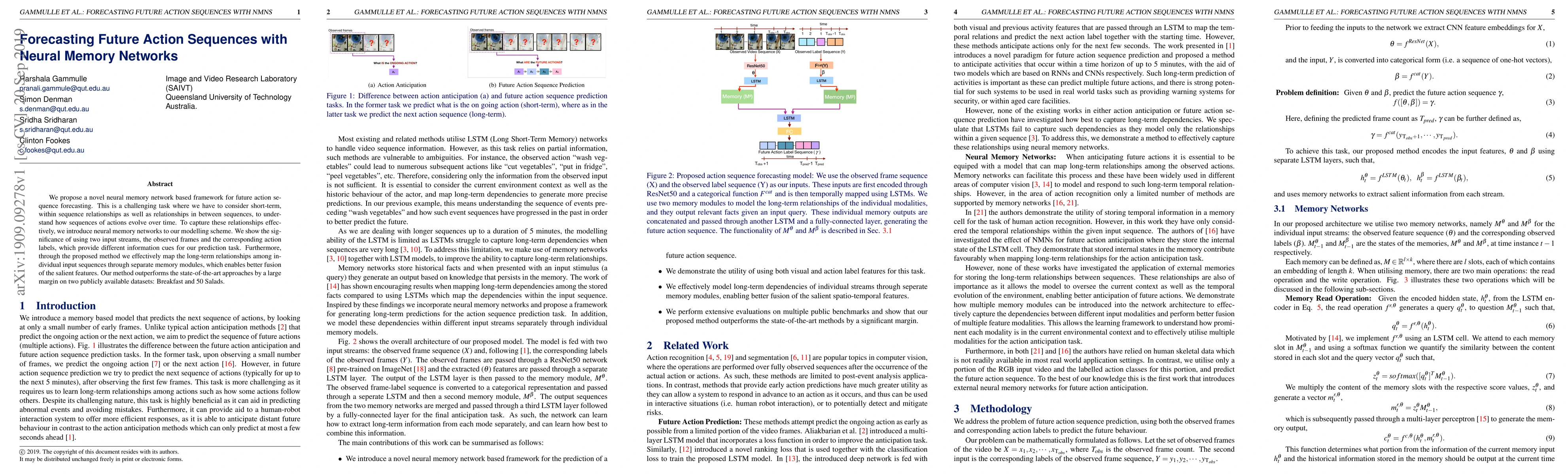 Researchers propose a novel neural memory network framework for forecasting future action sequences, achieving better performance than state-of-the-art approaches on two publicly available datasets.