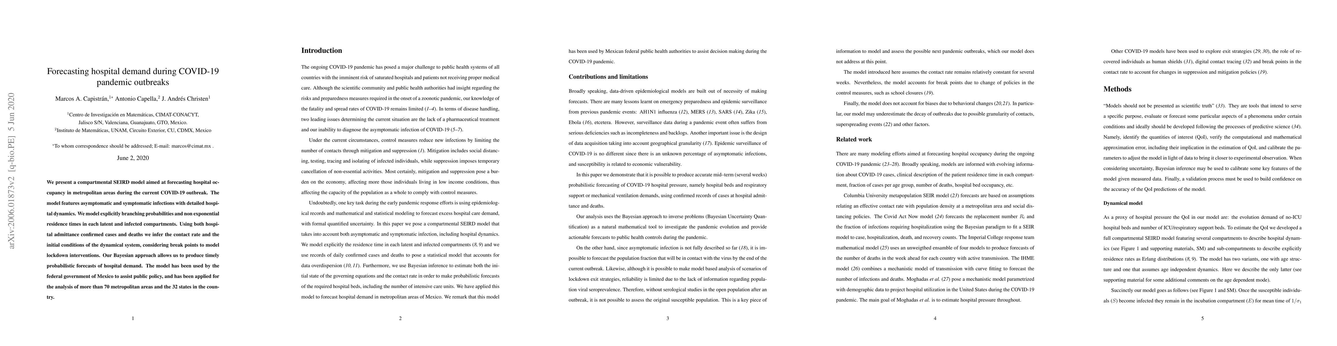 This research paper presents a compartmental SEIRD model to forecast hospital demand during COVID-19 outbreaks, providing timely probabilistic forecasts using a Bayesian approach that has been applied to over 70 metropolitan areas in Mexico.