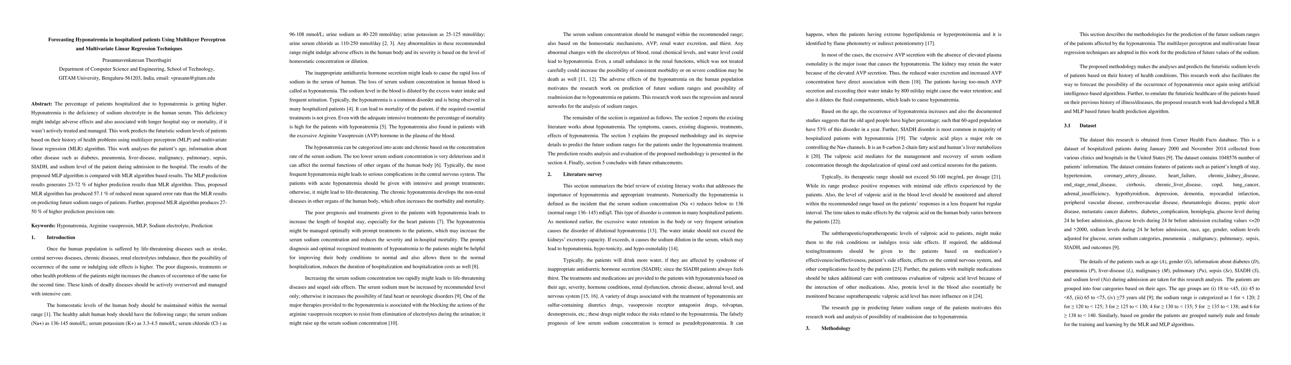 The percentage of patients hospitalized due to hyponatremia is getting higher. Hyponatremia is the deficiency of sodium electrolyte in the human serum. This deficiency might indulge adverse effects and also associated with longer hospital stay or mortality, if it wasnt actively treated and managed. This work predicts the futuristic sodium levels of patients based on their history of health problems using multilayer perceptron and multivariate linear regression algorithm. This work analyses the patients age, information about other disease such as diabetes, pneumonia, liver-disease, malignancy, pulmonary, sepsis, SIADH, and sodium level of the patient during admission to the hospital. The results of the proposed MLP algorithm is compared with MLR algorithm based results. The MLP prediction results generates 23-72 of higher prediction results than MLR algorithm. Thus, proposed MLR algorithm has produced 57.1 of reduced mean squared error rate than the MLR results on predicting future sodium ranges of patients. Further, proposed MLR algorithm produces 27-50 of higher prediction precision rate.