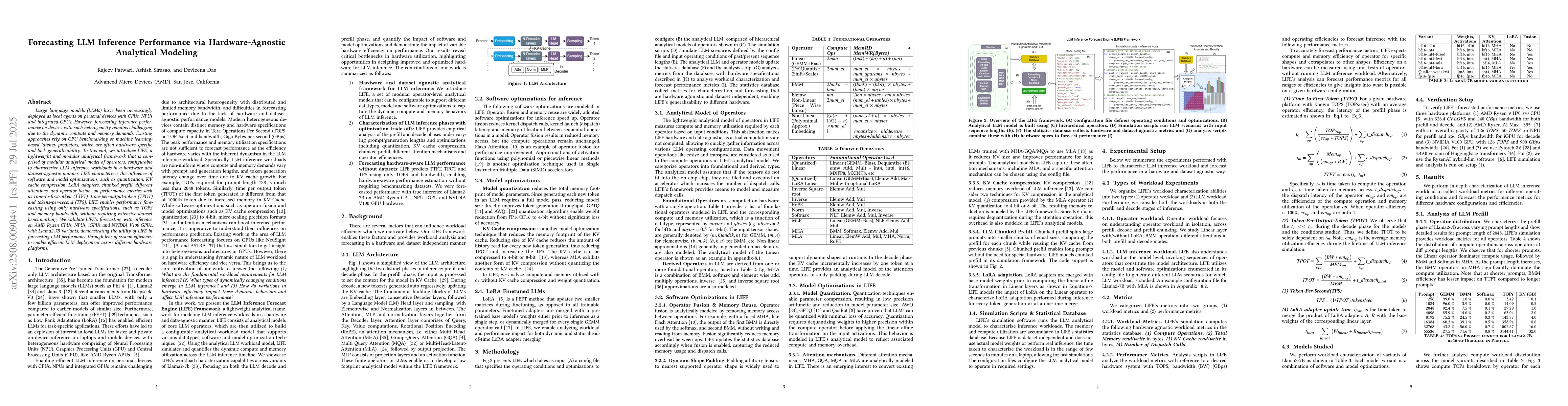 Large language models (LLMs) have been increasingly deployed as local agents on personal devices with CPUs, NPUs and integrated GPUs. However, forecasting inference performance on devices with such heterogeneity remains challenging due to the dynamic compute and memory demands. Existing approaches rely on GPU benchmarking or machine learning-based latency predictors, which are often hardware-specific and lack generalizability. To this end, we introduce LIFE, a lightweight and modular analytical framework that is comprised of modular analytical model of operators, configurable to characterize LLM inference workloads in a hardware and dataset-agnostic manner. LIFE characterizes the influence of software and model optimizations, such as quantization, KV cache compression, LoRA adapters, chunked prefill, different attentions, and operator fusion, on performance metrics such as time-to-first-token (TTFT), time-per-output-token (TPOT) and tokens-per-second (TPS). LIFE enables performance forecasting using only hardware specifications, such as TOPS and memory bandwidth, without requiring extensive dataset benchmarking. We validate LIFE's forecasting with inference on AMD Ryzen CPUs, NPUs, iGPUs and NVIDIA V100 GPUs, with Llama2-7B variants, demonstrating the utility of LIFE in forecasting LLM performance through lens of system efficiency to enable efficient LLM deployment across different hardware platforms.