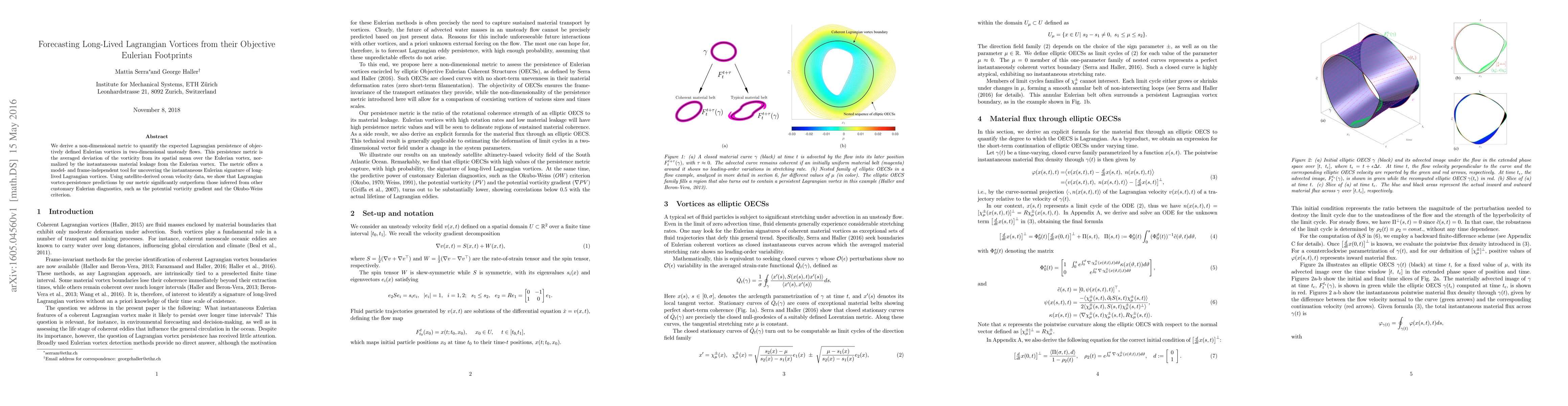 This paper introduces a new non-dimensional metric to predict the persistence of Lagrangian vortices in unsteady flows by analyzing their Eulerian footprints. The metric outperforms traditional diagnostics in forecasting the longevity of these vortices, as demonstrated using satellite-derived ocean velocity data.