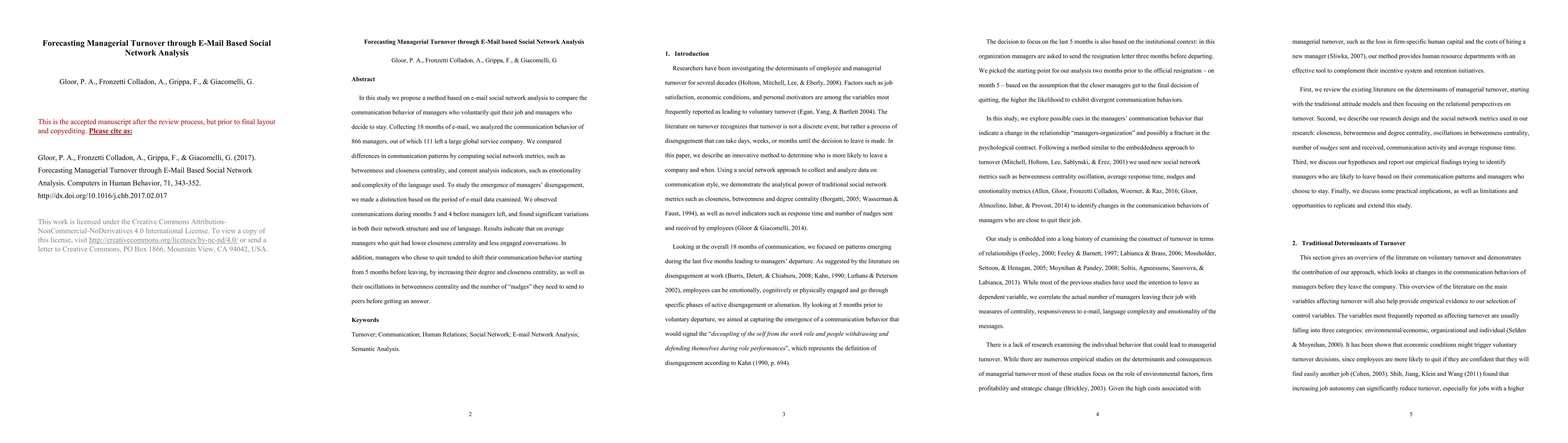 This study uses e-mail social network analysis to predict managerial turnover by comparing communication patterns of managers who left versus those who stayed. Findings reveal significant differences in network metrics and language complexity, indicating that managers who quit exhibit lower centrality and less engaged communication, with notable shifts in behavior five months prior to departure.