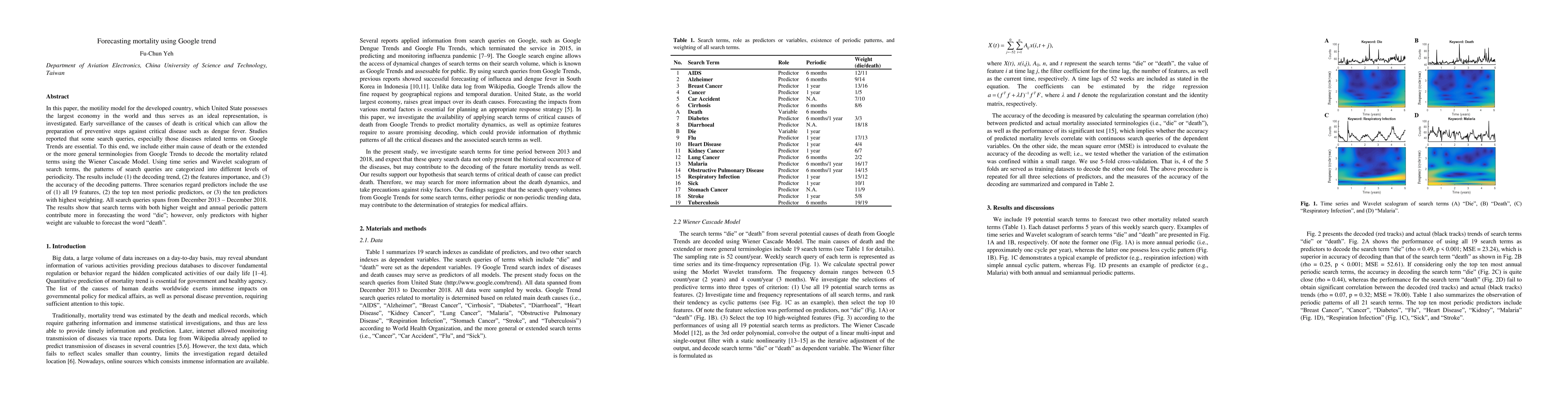 In this paper, the motility model for the developed country, which United State possesses the largest economy in the world and thus serves as an ideal representation, is investigated. Early surveillance of the causes of death is critical which can allow the preparation of preventive steps against critical disease such as dengue fever. Studies reported that some search queries, especially those diseases related terms on Google Trends are essential. To this end, we include either main cause of death or the extended or the more general terminologies from Google Trends to decode the mortality related terms using the Wiener Cascade Model. Using time series and Wavelet scalogram of search terms, the patterns of search queries are categorized into different levels of periodicity. The results include the decoding trend, the features importance, and the accuracy of the decoding patterns. Three scenarios regard predictors include the use of all 19 features, the top ten most periodic predictors, or the ten predictors with highest weighting. All search queries spans from December 2013 - December 2018. The results show that search terms with both higher weight and annual periodic pattern contribute more in forecasting the word die; however, only predictors with higher weight are valuable to forecast the word death.