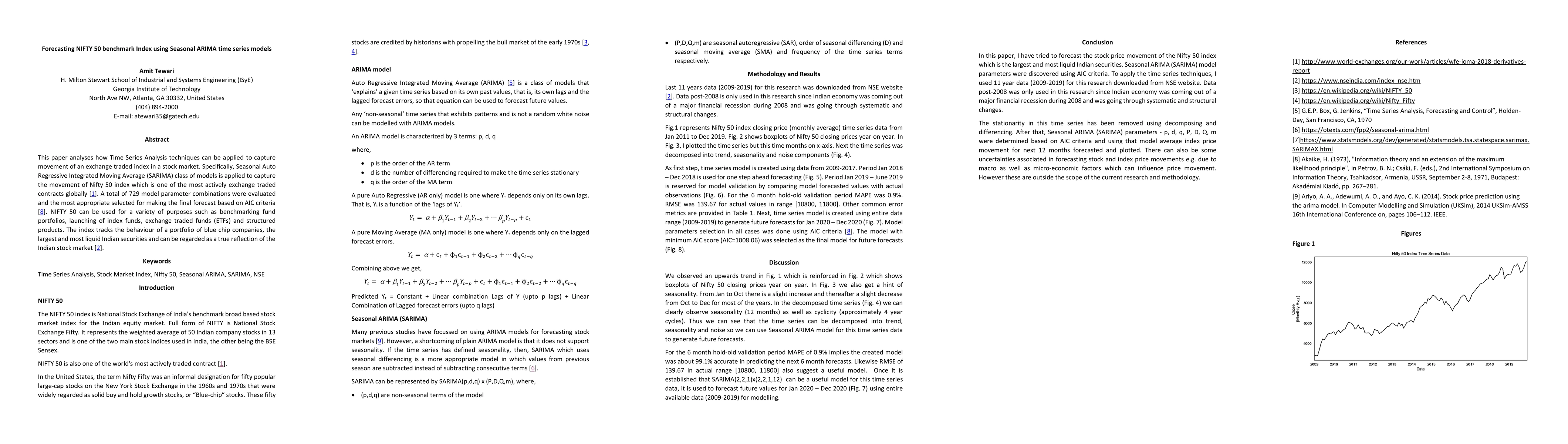 This paper evaluates Seasonal ARIMA (SARIMA) models for forecasting the Nifty 50 index, assessing 729 parameter combinations and selecting the best model based on AIC criteria. The Nifty 50 serves as a benchmark for various financial products and reflects the Indian stock market's performance.