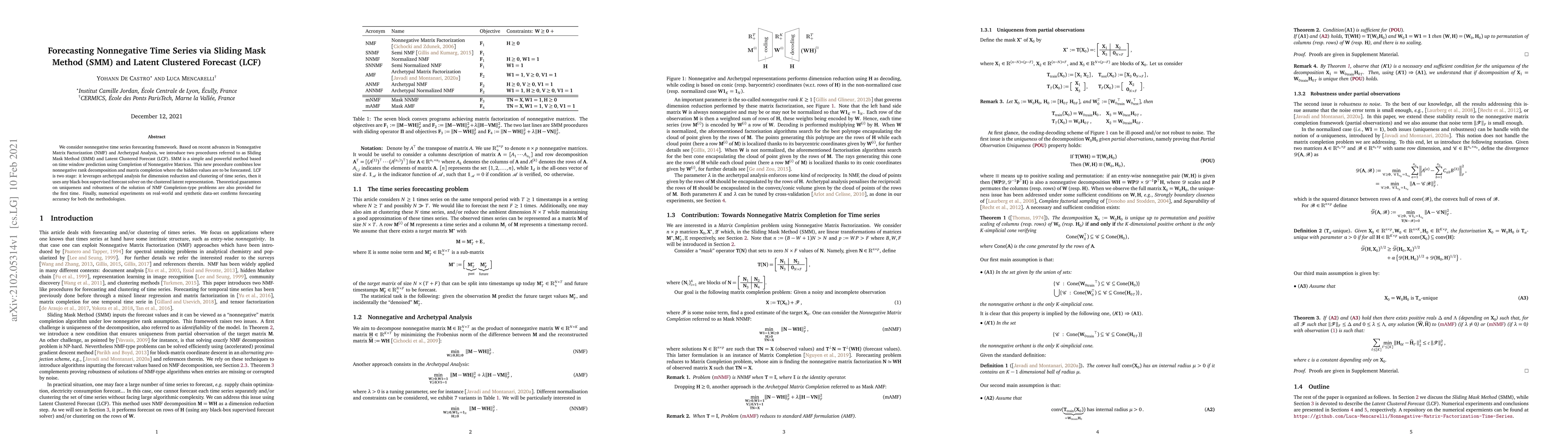 We consider nonnegative time series forecasting framework. Based on recent advances in Nonnegative Matrix Factorization (NMF) and Archetypal Analysis, we introduce two procedures referred to as Sliding Mask Method (SMM) and Latent Clustered Forecast (LCF). SMM is a simple and powerful method based on time window prediction using Completion of Nonnegative Matrices. This new procedure combines low nonnegative rank decomposition and matrix completion where the hidden values are to be forecasted. LCF is two stage: it leverages archetypal analysis for dimension reduction and clustering of time series, then it uses any black-box supervised forecast solver on the clustered latent representation. Theoretical guarantees on uniqueness and robustness of the solution of NMF Completion-type problems are also provided for the first time. Finally, numerical experiments on real-world and synthetic data-set confirms forecasting accuracy for both the methodologies.