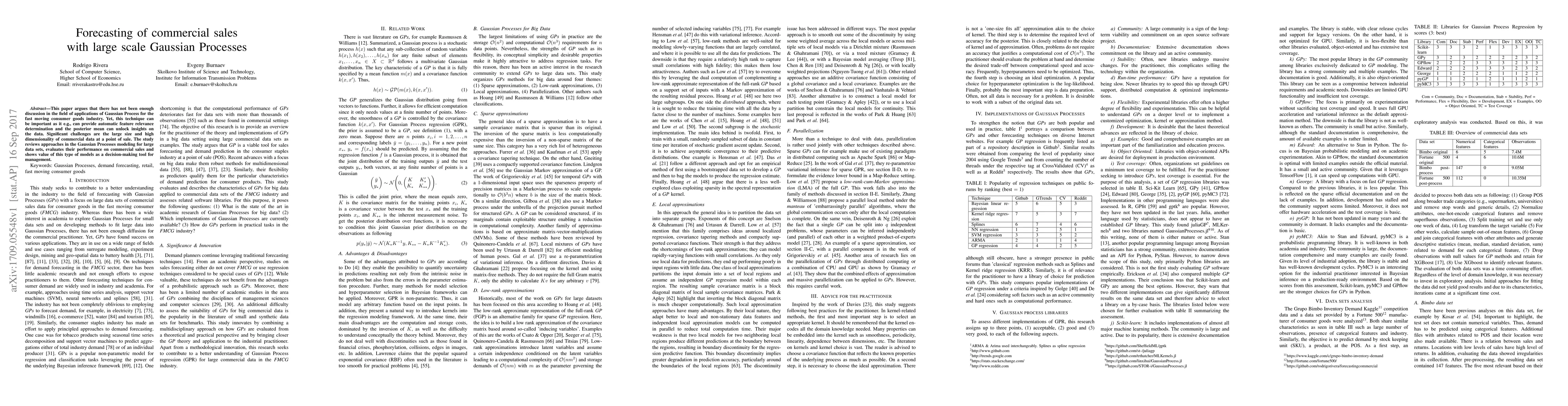 This paper argues that there has not been enough discussion in the field of applications of Gaussian Process for the fast moving consumer goods industry. Yet, this technique can be important as it e.g., can provide automatic feature relevance determination and the posterior mean can unlock insights on the data. Significant challenges are the large size and high dimensionality of commercial data at a point of sale. The study reviews approaches in the Gaussian Processes modeling for large data sets, evaluates their performance on commercial sales and shows value of this type of models as a decision-making tool for management.