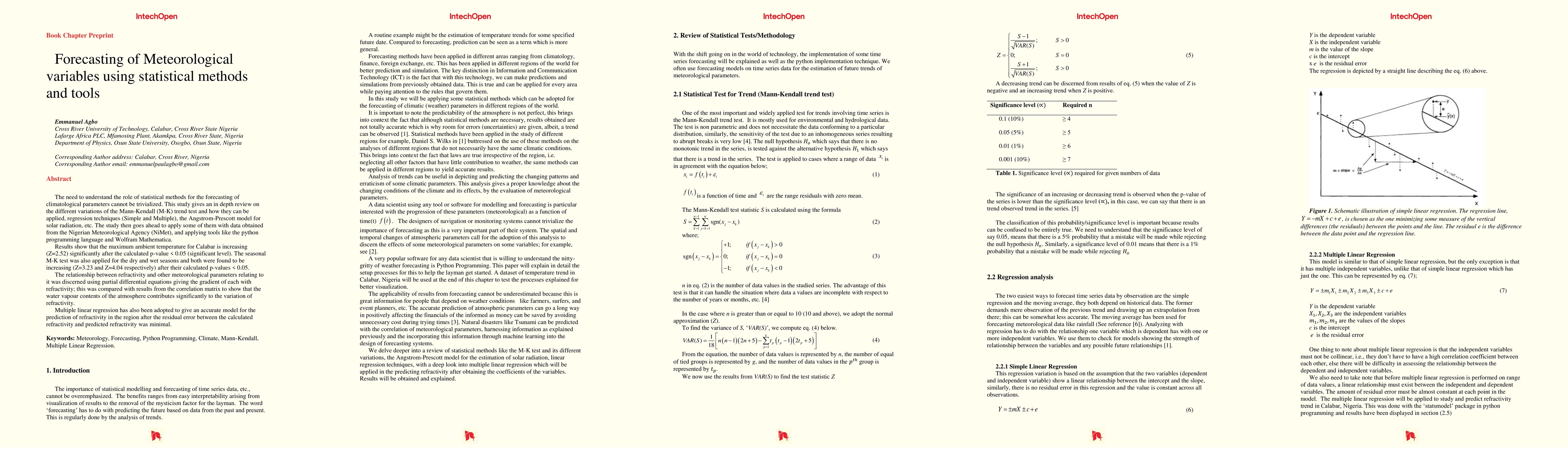 The need to understand the role of statistical methods for the forecasting of climatological parameters cannot be trivialized. This study gives an in depth review on the different variations of the Mann-Kendall (M-K) trend test and how they can be applied, regression techniques (Simple and Multiple), the Angstrom-Prescott model for solar radiation, etc. The study then goes ahead to apply some of them with data obtained from the Nigerian Meteorological Agency (NiMet), and applying tools like the python programming language and Wolfram Mathematica. Results show that the maximum ambient temperature for Calabar is increasing (Z=2.52) significantly after the calculated p-value < 0.05 (significant level). The seasonal M-K test was also applied for the dry and wet seasons and both were found to be increasing (Z=3.23 and Z=4.04 respectively) after their calculated p-values < 0.05. The relationship between refractivity and other meteorological parameters relating to it was discerned using partial differential equations giving the gradient of each with refractivity; this was compared with results from the correlation matrix to show that the water vapour contents of the atmosphere contributes significantly to the variation of refractivity. Multiple linear regression has also been adopted to give an accurate model for the prediction of refractivity in the region after the residual error between the calculated refractivity and predicted refractivity was minimal.