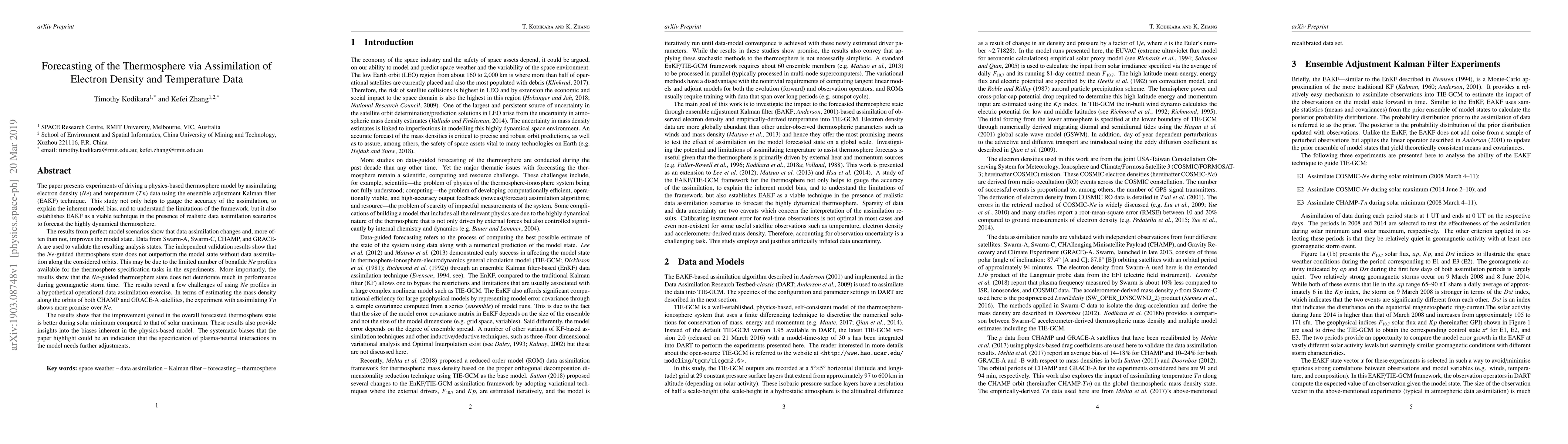 Researchers used a data assimilation technique to improve forecasts of the thermosphere by combining electron density and temperature data from satellites. The results show that data assimilation improves model accuracy, especially during solar minimum conditions.