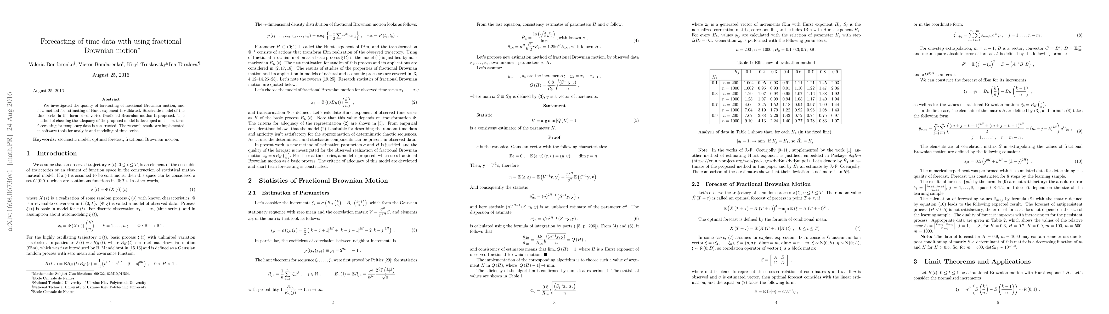 We investigated the quality of forecasting of fractional Brownian motion, and new method for estimating of Hurst exponent is validated. Stochastic model of the time series in the form of converted fractional Brownian motion is proposed. The method of checking the adequacy of the proposed model is developed and short-term forecasting for temporary data is constructed. The research results are implemented.in software tools for analysis and modeling of time series.