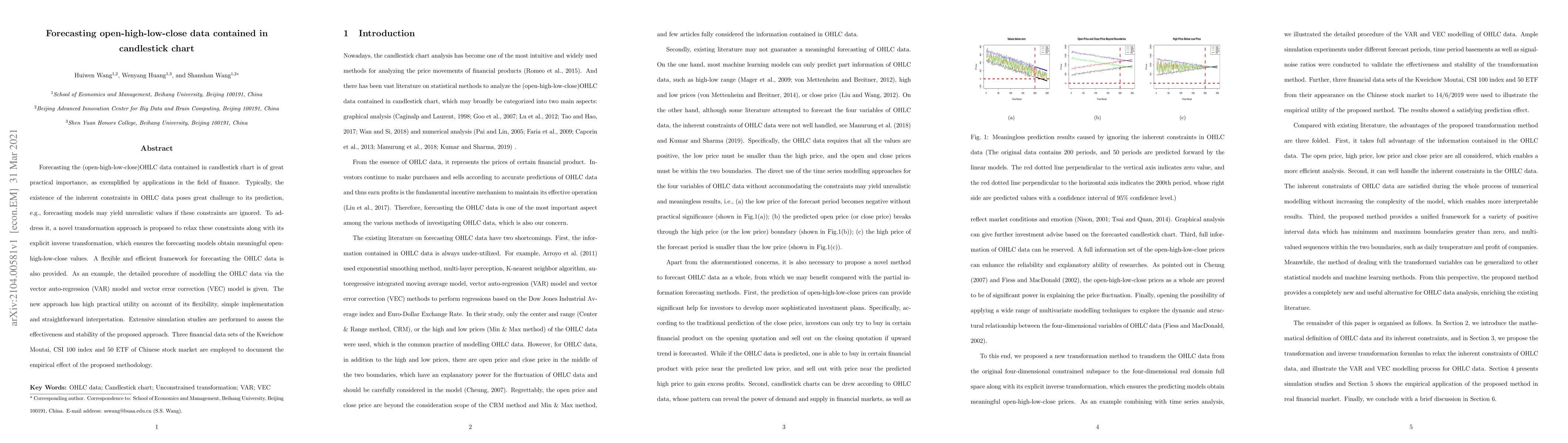 Forecasting the (open-high-low-close)OHLC data contained in candlestick chart is of great practical importance, as exemplified by applications in the field of finance. Typically, the existence of the inherent constraints in OHLC data poses great challenge to its prediction, e.g., forecasting models may yield unrealistic values if these constraints are ignored. To address it, a novel transformation approach is proposed to relax these constraints along with its explicit inverse transformation, which ensures the forecasting models obtain meaningful openhigh-low-close values. A flexible and efficient framework for forecasting the OHLC data is also provided. As an example, the detailed procedure of modelling the OHLC data via the vector auto-regression (VAR) model and vector error correction (VEC) model is given. The new approach has high practical utility on account of its flexibility, simple implementation and straightforward interpretation. Extensive simulation studies are performed to assess the effectiveness and stability of the proposed approach. Three financial data sets of the Kweichow Moutai, CSI 100 index and 50 ETF of Chinese stock market are employed to document the empirical effect of the proposed methodology.