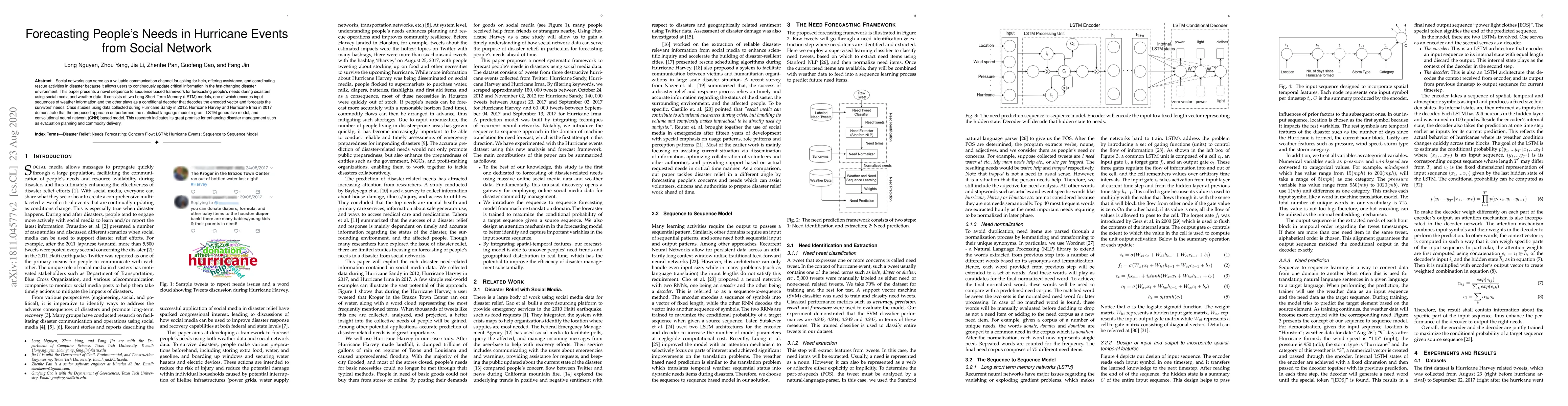This paper introduces a sequence-to-sequence framework using LSTM models to forecast people's needs during hurricanes by analyzing social media and weather data. The proposed method outperforms traditional statistical and LSTM models, demonstrating improved disaster management capabilities.