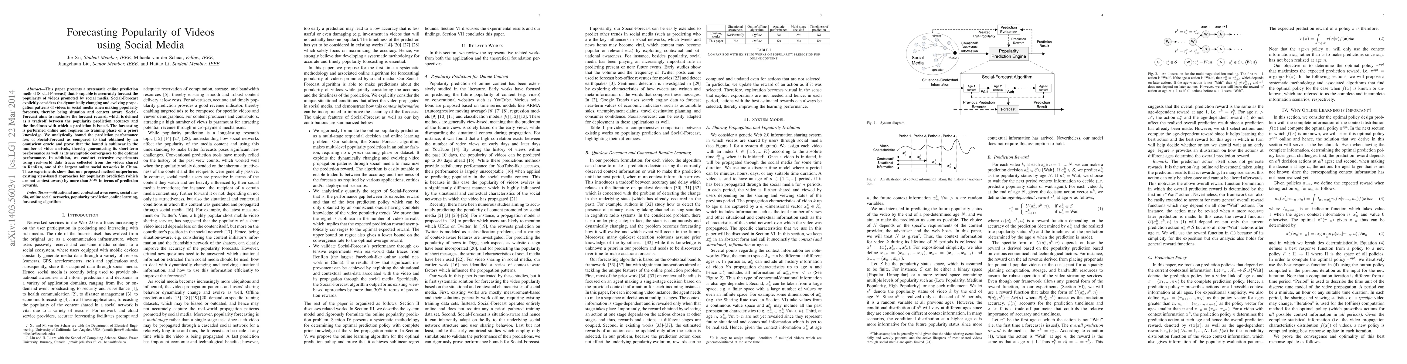 This paper introduces Social-Forecast, an online prediction method for forecasting video popularity on social media, which adapts to evolving propagation patterns and maximizes a tradeoff between prediction accuracy and timeliness. Experiments on RenRen data show it outperforms existing view-based methods by over 30% in prediction rewards.