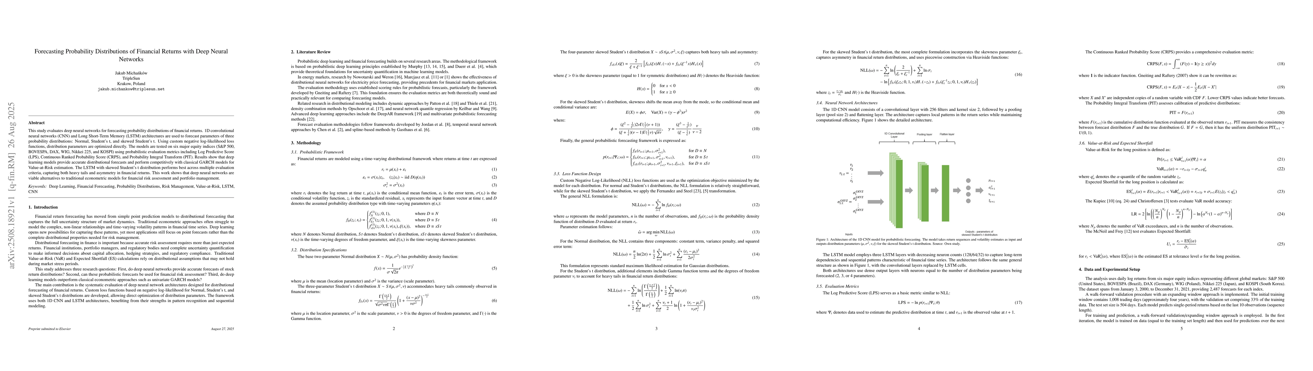 This study evaluates deep neural networks for forecasting probability distributions of financial returns. 1D convolutional neural networks (CNN) and Long Short-Term Memory (LSTM) architectures are used to forecast parameters of three probability distributions: Normal, Student's t, and skewed Student's t. Using custom negative log-likelihood loss functions, distribution parameters are optimized directly. The models are tested on six major equity indices (S\&P 500, BOVESPA, DAX, WIG, Nikkei 225, and KOSPI) using probabilistic evaluation metrics including Log Predictive Score (LPS), Continuous Ranked Probability Score (CRPS), and Probability Integral Transform (PIT). Results show that deep learning models provide accurate distributional forecasts and perform competitively with classical GARCH models for Value-at-Risk estimation. The LSTM with skewed Student's t distribution performs best across multiple evaluation criteria, capturing both heavy tails and asymmetry in financial returns. This work shows that deep neural networks are viable alternatives to traditional econometric models for financial risk assessment and portfolio management.