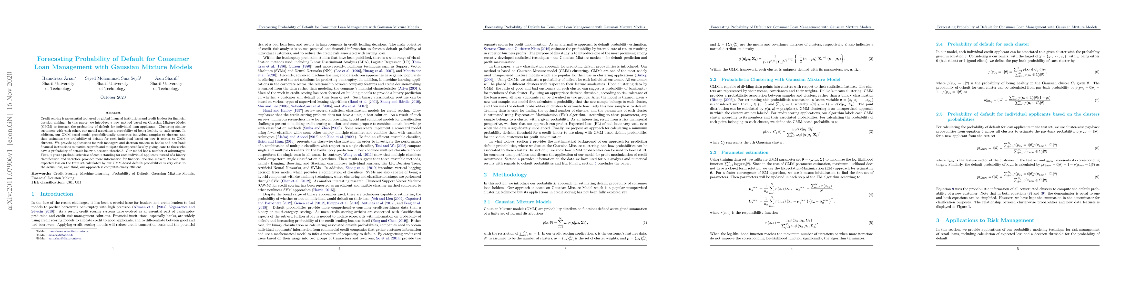 This paper introduces a Gaussian Mixture Model to forecast consumer loan default probabilities, providing a probabilistic view of credit standing for individual applicants and improving financial decision making with accurate loss estimates.