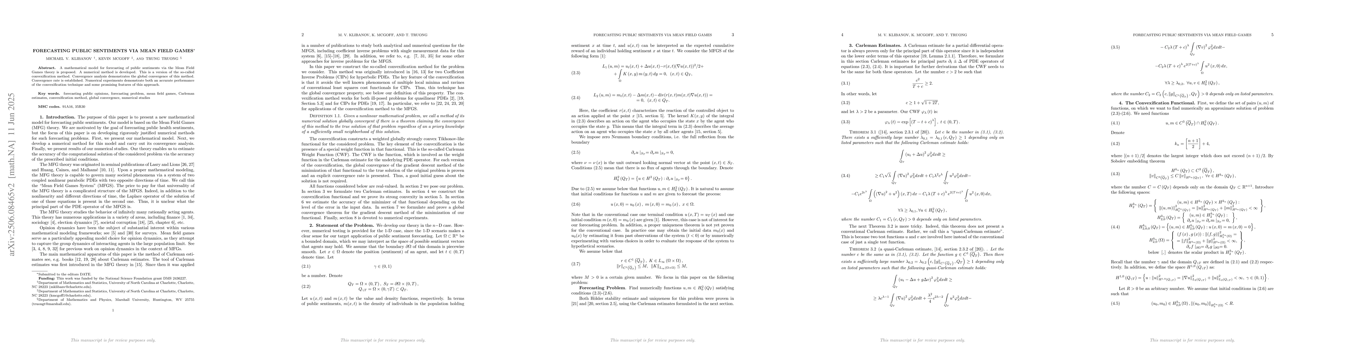 This paper proposes a new method for forecasting public sentiments using Mean Field Games theory, demonstrating its accuracy and global convergence in numerical experiments.