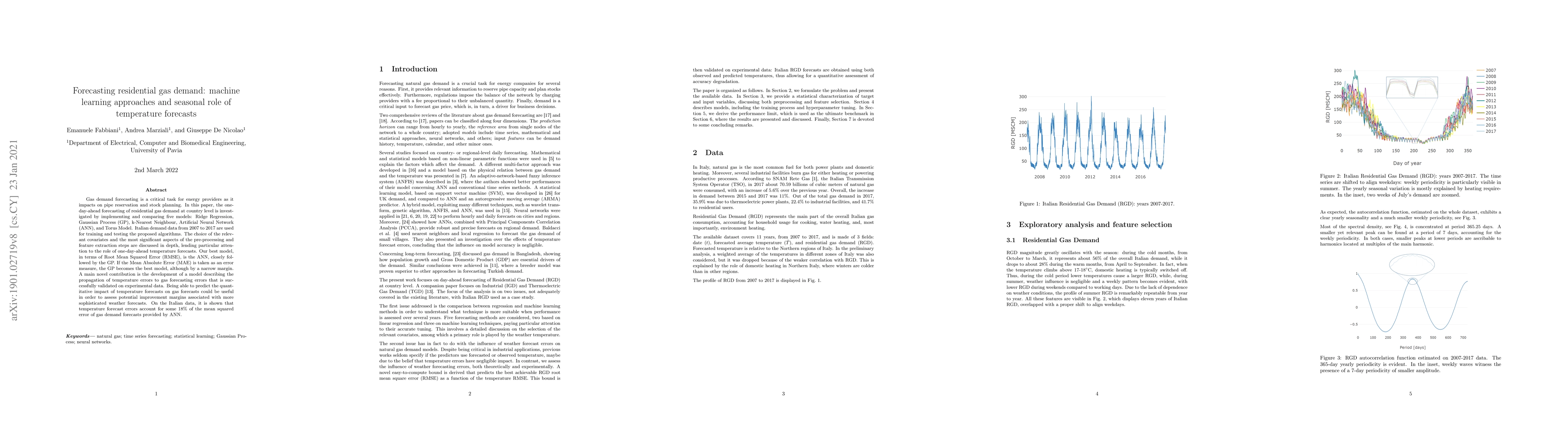 Gas demand forecasting is a critical task for energy providers as it impacts on pipe reservation and stock planning. In this paper, the one-day-ahead forecasting of residential gas demand at country level is investigated by implementing and comparing five models: Ridge Regression, Gaussian Process (GP), k-Nearest Neighbour, Artificial Neural Network (ANN), and Torus Model. Italian demand data from 2007 to 2017 are used for training and testing the proposed algorithms. The choice of the relevant covariates and the most significant aspects of the pre-processing and feature extraction steps are discussed in-depth, lending particular attention to the role of one-day-ahead temperature forecasts. Our best model, in terms of Root Mean Squared Error (RMSE), is the ANN, closely followed by the GP. If the Mean Absolute Error (MAE) is taken as an error measure, the GP becomes the best model, although by a narrow margin. A main novel contribution is the development of a model describing the propagation of temperature errors to gas forecasting errors that is successfully validated on experimental data. Being able to predict the quantitative impact of temperature forecasts on gas forecasts could be useful in order to assess potential improvement margins associated with more sophisticated weather forecasts. On the Italian data, it is shown that temperature forecast errors account for some 18% of the mean squared error of gas demand forecasts provided by ANN.