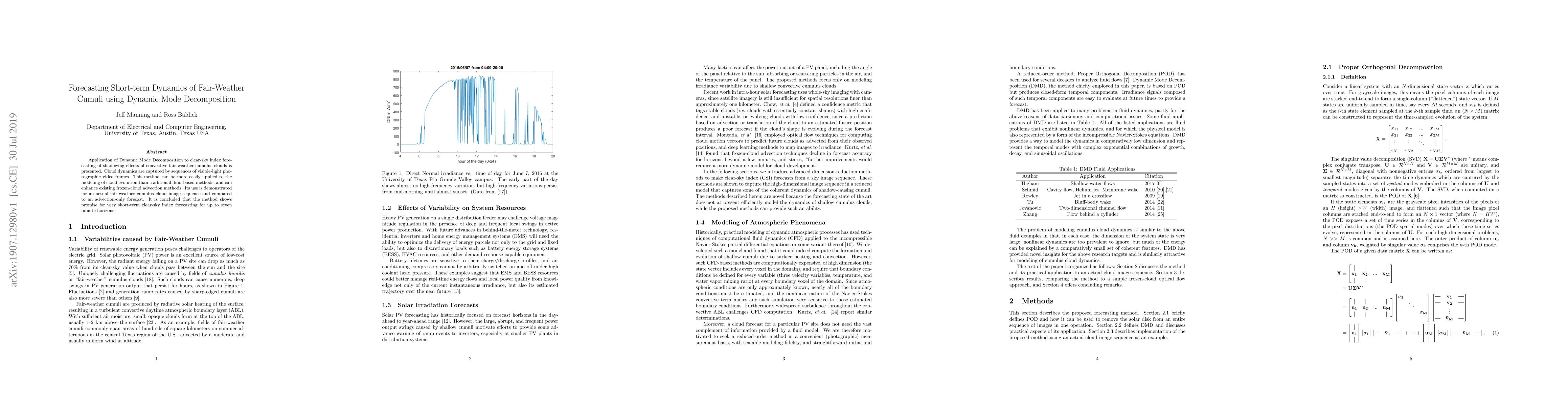 This paper applies Dynamic Mode Decomposition to forecast the short-term dynamics of fair-weather cumulus clouds, demonstrating its effectiveness in predicting shadowing effects compared to traditional advection-only methods. The method shows promise for clear-sky index forecasting up to seven minutes ahead.