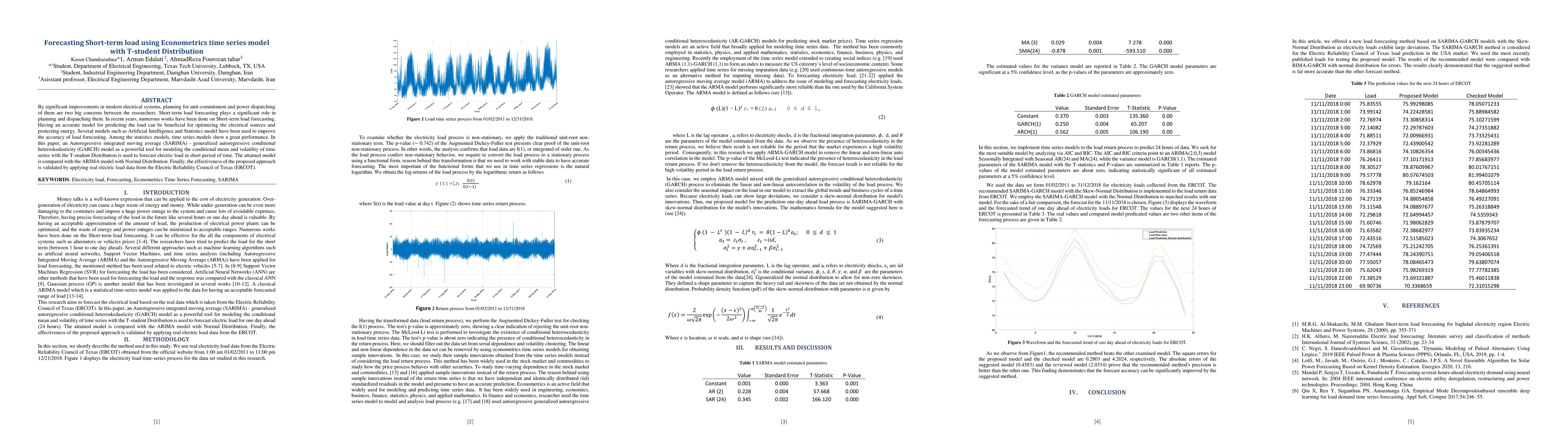 By significant improvements in modern electrical systems, planning for unit commitment and power dispatching of them are two big concerns between the researchers. Short-term load forecasting plays a significant role in planning and dispatching them. In recent years, numerous works have been done on Short-term load forecasting. Having an accurate model for predicting the load can be beneficial for optimizing the electrical sources and protecting energy. Several models such as Artificial Intelligence and Statistics model have been used to improve the accuracy of load forecasting. Among the statistics models, time series models show a great performance. In this paper, an Autoregressive integrated moving average (SARIMA) - generalized autoregressive conditional heteroskedasticity (GARCH) model as a powerful tool for modeling the conditional mean and volatility of time series with the T-student Distribution is used to forecast electric load in short period of time. The attained model is compared with the ARIMA model with Normal Distribution. Finally, the effectiveness of the proposed approach is validated by applying real electric load data from the Electric Reliability Council of Texas (ERCOT). KEYWORDS: Electricity load, Forecasting, Econometrics Time Series Forecasting, SARIMA