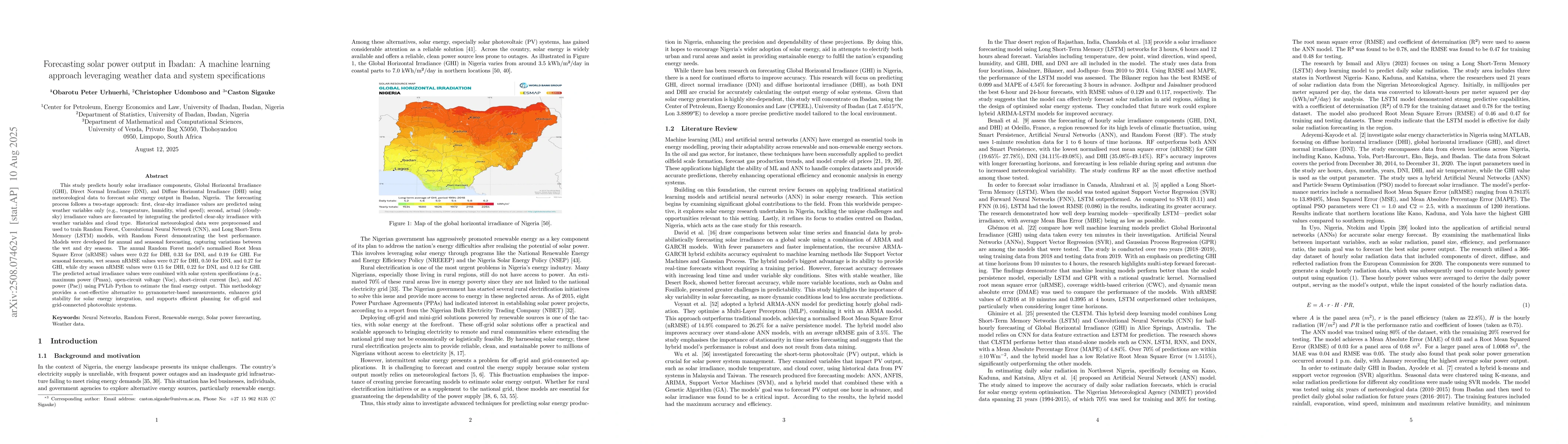 This study predicts hourly solar irradiance components, Global Horizontal Irradiance (GHI), Direct Normal Irradiance (DNI), and Diffuse Horizontal Irradiance (DHI) using meteorological data to forecast solar energy output in Ibadan, Nigeria. The forecasting process follows a two-stage approach: first, clear-sky irradiance values are predicted using weather variables only (e.g., temperature, humidity, wind speed); second, actual (cloudy-sky) irradiance values are forecasted by integrating the predicted clear-sky irradiance with weather variables and cloud type. Historical meteorological data were preprocessed and used to train Random Forest, Convolutional Neural Network (CNN), and Long Short-Term Memory (LSTM) models, with Random Forest demonstrating the best performance. Models were developed for annual and seasonal forecasting, capturing variations between the wet and dry seasons. The annual Random Forest model's normalised Root Mean Square Error (nRMSE) values were 0.22 for DHI, 0.33 for DNI, and 0.19 for GHI. For seasonal forecasts, wet season nRMSE values were 0.27 for DHI, 0.50 for DNI, and 0.27 for GHI, while dry season nRMSE values were 0.15 for DHI, 0.22 for DNI, and 0.12 for GHI. The predicted actual irradiance values were combined with solar system specifications (e.g., maximum power (Pmax), open-circuit voltage (Voc), short-circuit current (Isc), and AC power (Pac)) using PVLib Python to estimate the final energy output. This methodology provides a cost-effective alternative to pyranometer-based measurements, enhances grid stability for solar energy integration, and supports efficient planning for off-grid and grid-connected photovoltaic systems.