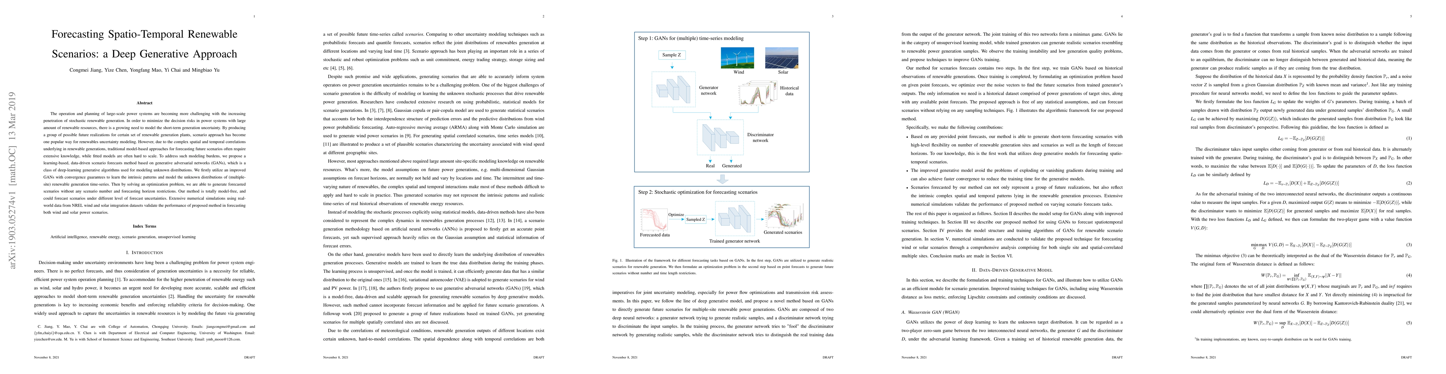 This paper proposes a deep generative approach using improved GANs to model and forecast spatio-temporal scenarios of renewable generation, addressing the challenges of spatial and temporal correlations in renewable energy sources. The model-free method generates future scenarios without restrictions on scenario numbers or forecasting horizons, validated through simulations on real-world wind and solar datasets.