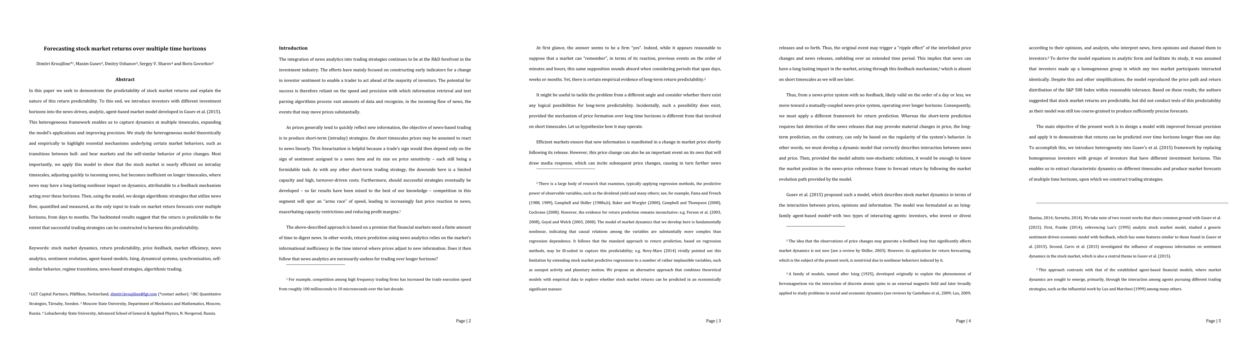 In this paper we seek to demonstrate the predictability of stock market returns and explain the nature of this return predictability. To this end, we introduce investors with different investment horizons into the news-driven, analytic, agent-based market model developed in Gusev et al. (2015). This heterogeneous framework enables us to capture dynamics at multiple timescales, expanding the model's applications and improving precision. We study the heterogeneous model theoretically and empirically to highlight essential mechanisms underlying certain market behaviors, such as transitions between bull- and bear markets and the self-similar behavior of price changes. Most importantly, we apply this model to show that the stock market is nearly efficient on intraday timescales, adjusting quickly to incoming news, but becomes inefficient on longer timescales, where news may have a long-lasting nonlinear impact on dynamics, attributable to a feedback mechanism acting over these horizons. Then, using the model, we design algorithmic strategies that utilize news flow, quantified and measured, as the only input to trade on market return forecasts over multiple horizons, from days to months. The backtested results suggest that the return is predictable to the extent that successful trading strategies can be constructed to harness this predictability.
