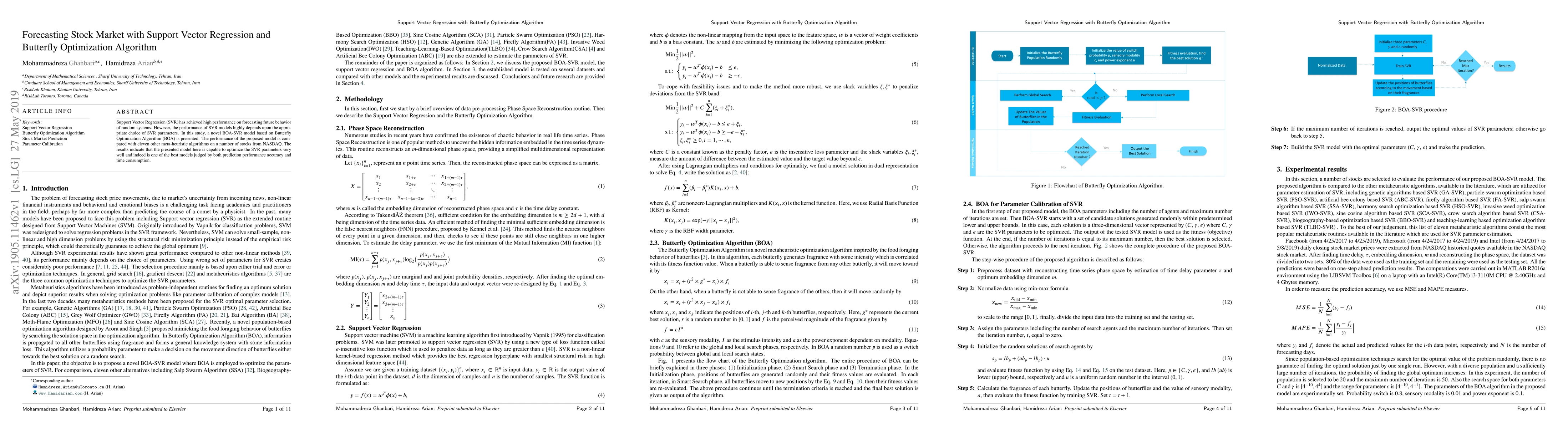 This paper proposes a Butterfly Optimization Algorithm (BOA)-enhanced Support Vector Regression (SVR) model for stock market forecasting. The BOA-SVR model optimizes SVR parameters to improve forecasting accuracy, outperforming eleven other meta-heuristic algorithms in terms of both prediction performance and time efficiency.