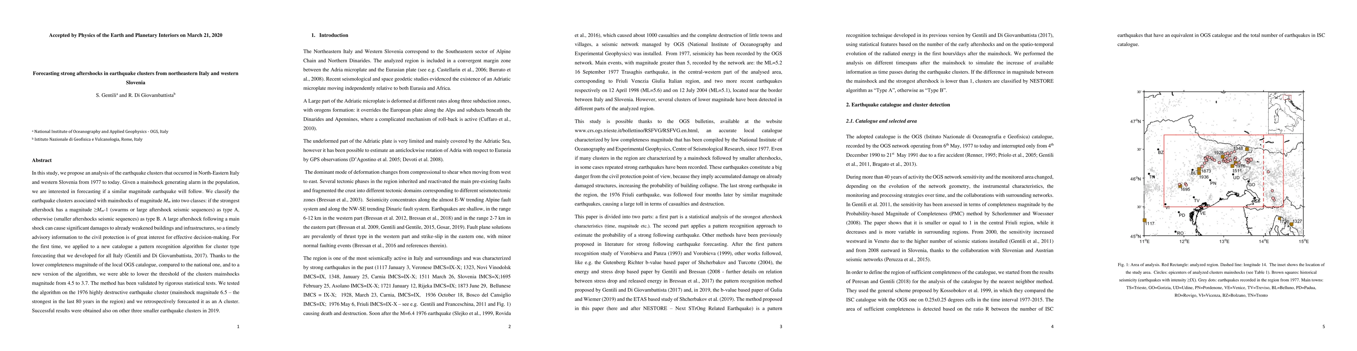 This study introduces a method to forecast strong aftershocks in earthquake clusters using a pattern recognition algorithm. Applied to northeastern Italy and western Slovenia, the algorithm successfully classified clusters into types A (with significant aftershocks) and B (smaller aftershocks). It was validated with statistical tests and successfully predicted past clusters, including the destructive 1976 event and smaller 2019 clusters, offering valuable information for civil protection.
